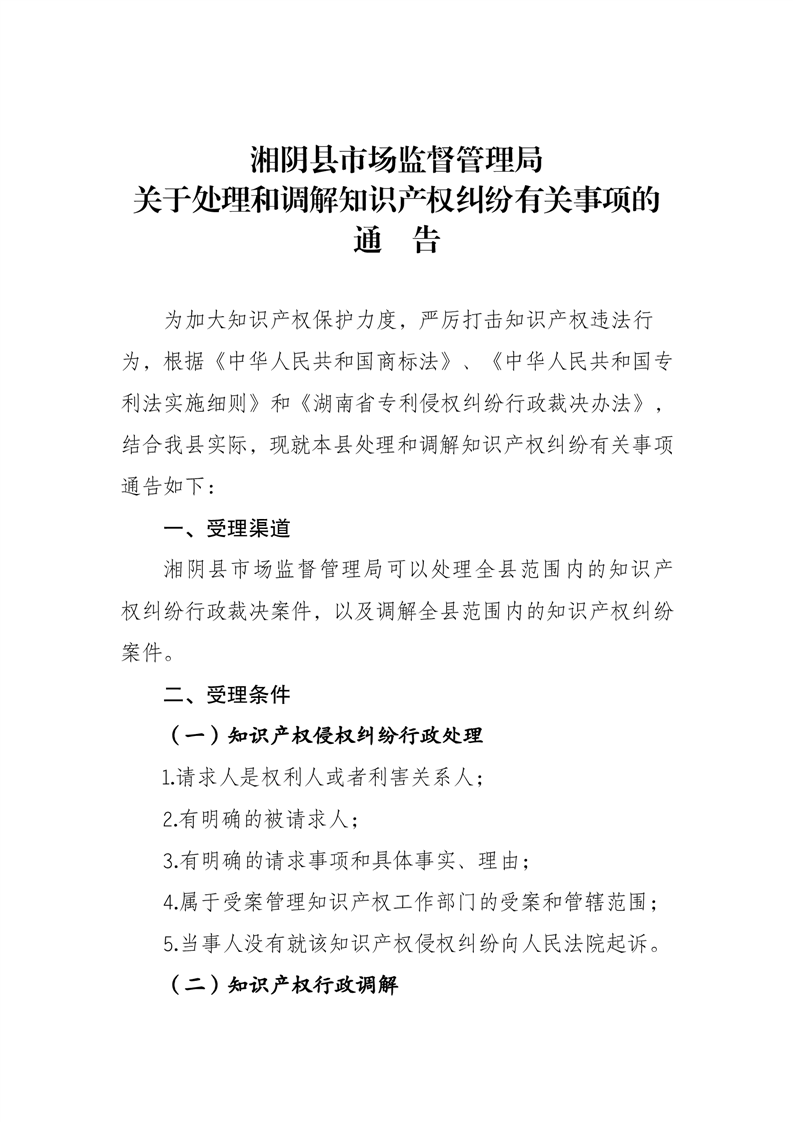 湘阴县市场监督管理局关于处理和调解知识产权纠纷有关事项的通 告