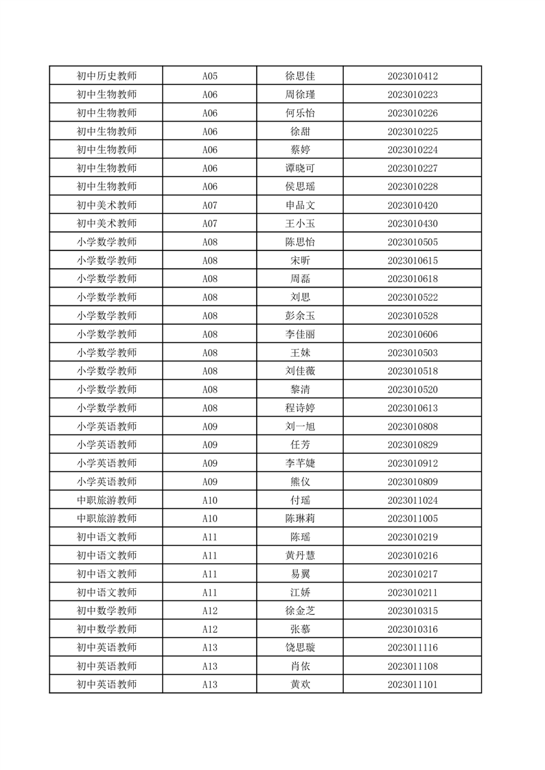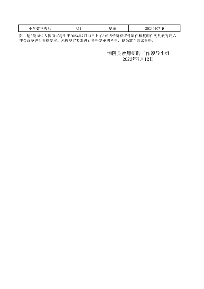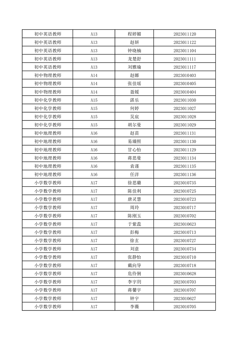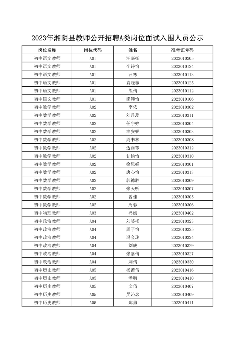 2023年湘阴县教师公开招聘A类岗位面试入围人员公示