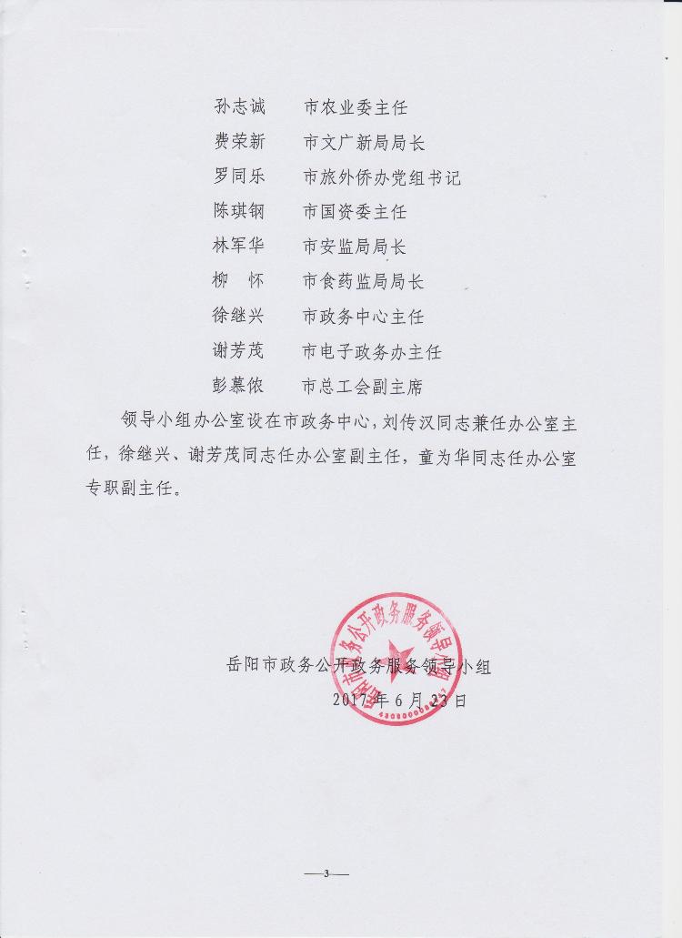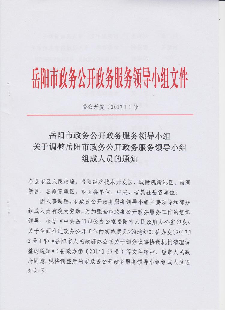 关于调整岳阳市政务公开政务服务领导小组的通知(岳公开办发〔2017〕1号)