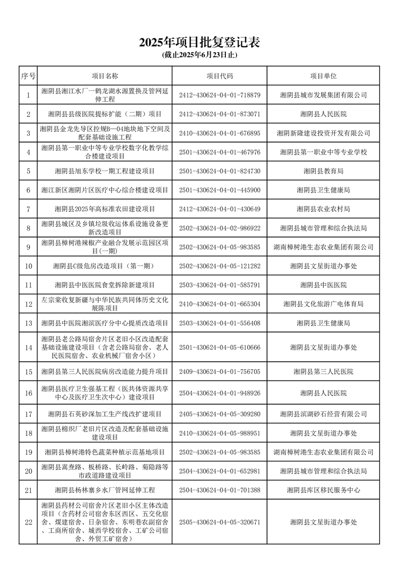 湘阴县发展和改革局项目审批表(2025.1-2025.6)