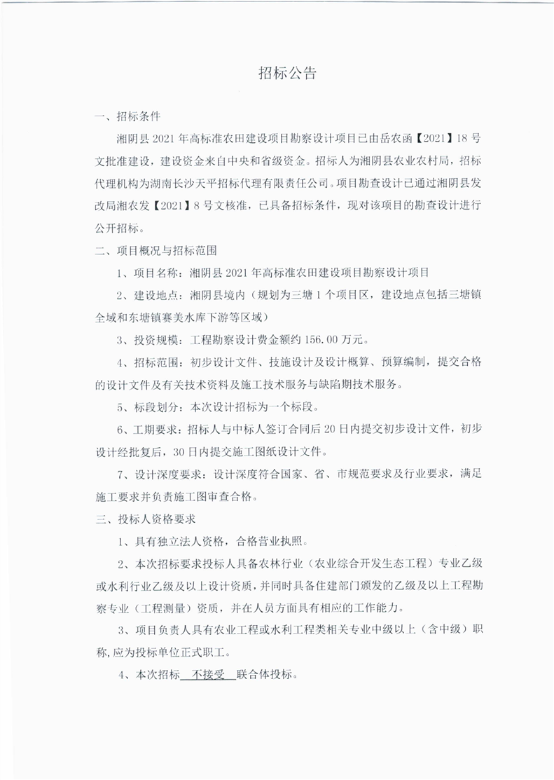 湘阴县2021年高标准农田建设项目勘察设计项目招标公告