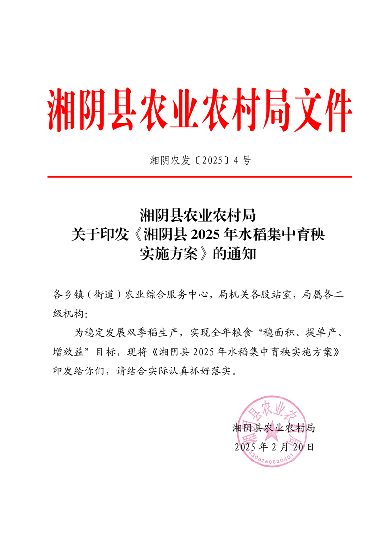 关于印发《湘阴县2025年水稻集中育秧实施方案》的通知