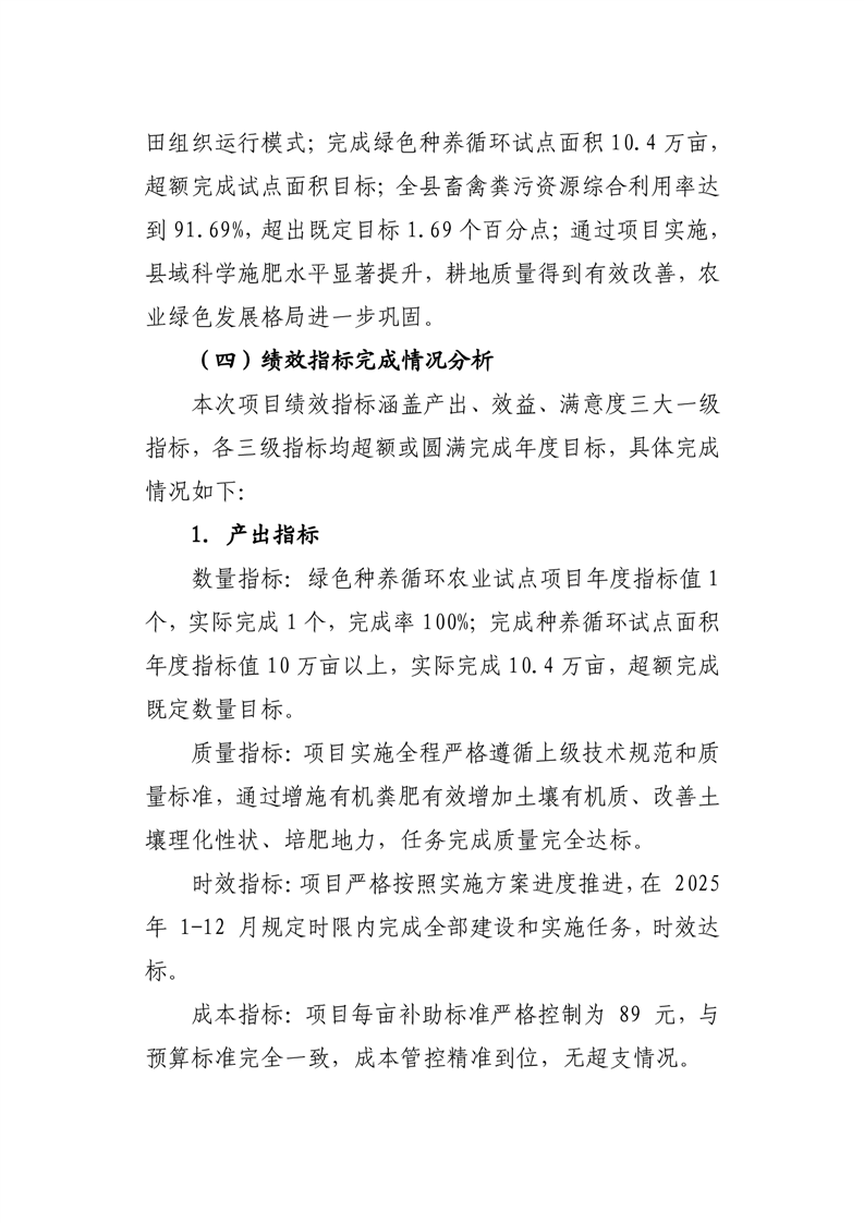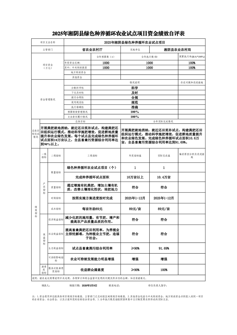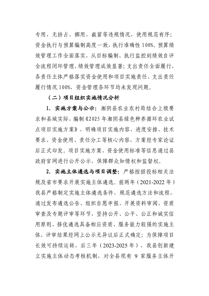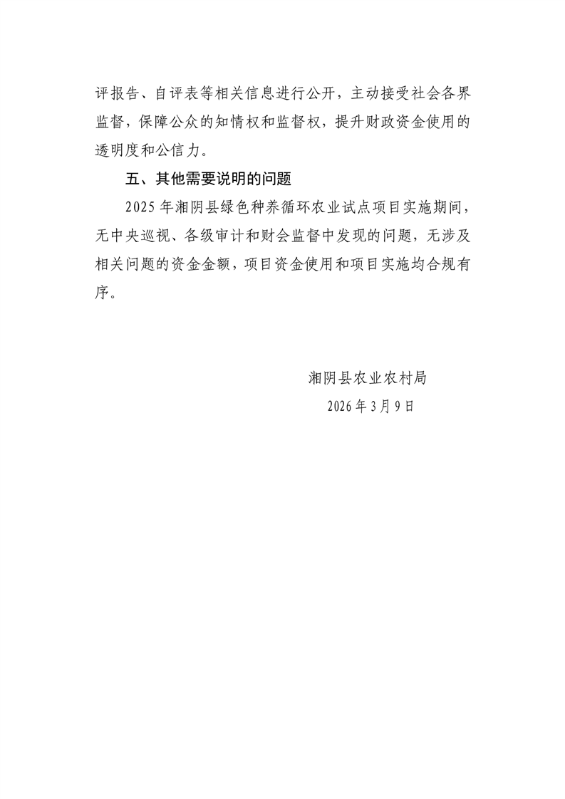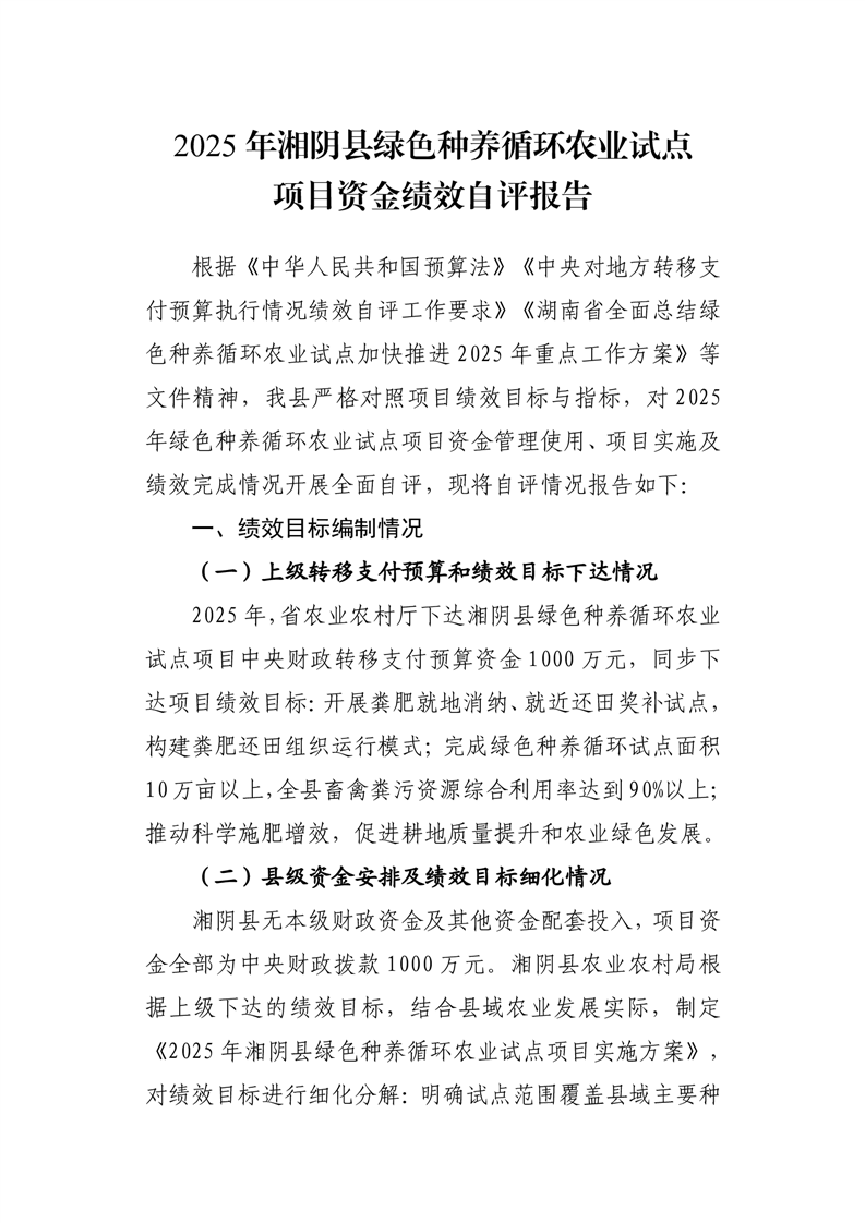 2025年湘阴县绿色种养循环农业试点项目资金绩效自评报告公示