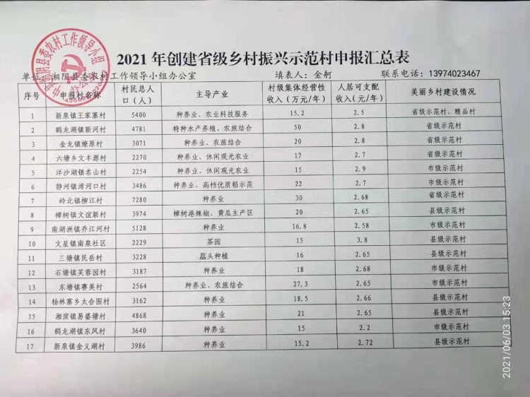 2021年创建省级乡村振兴示范村申报汇总表公示