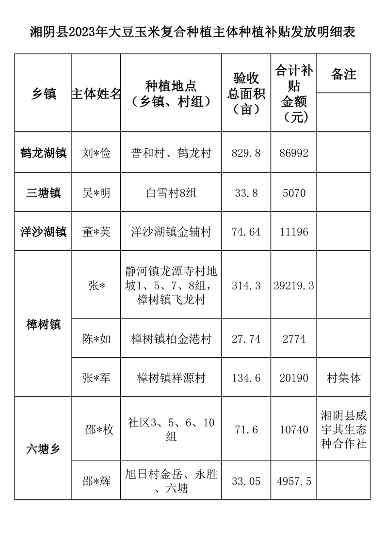 湘阴县2023年大豆玉米复合种植主体情况公示