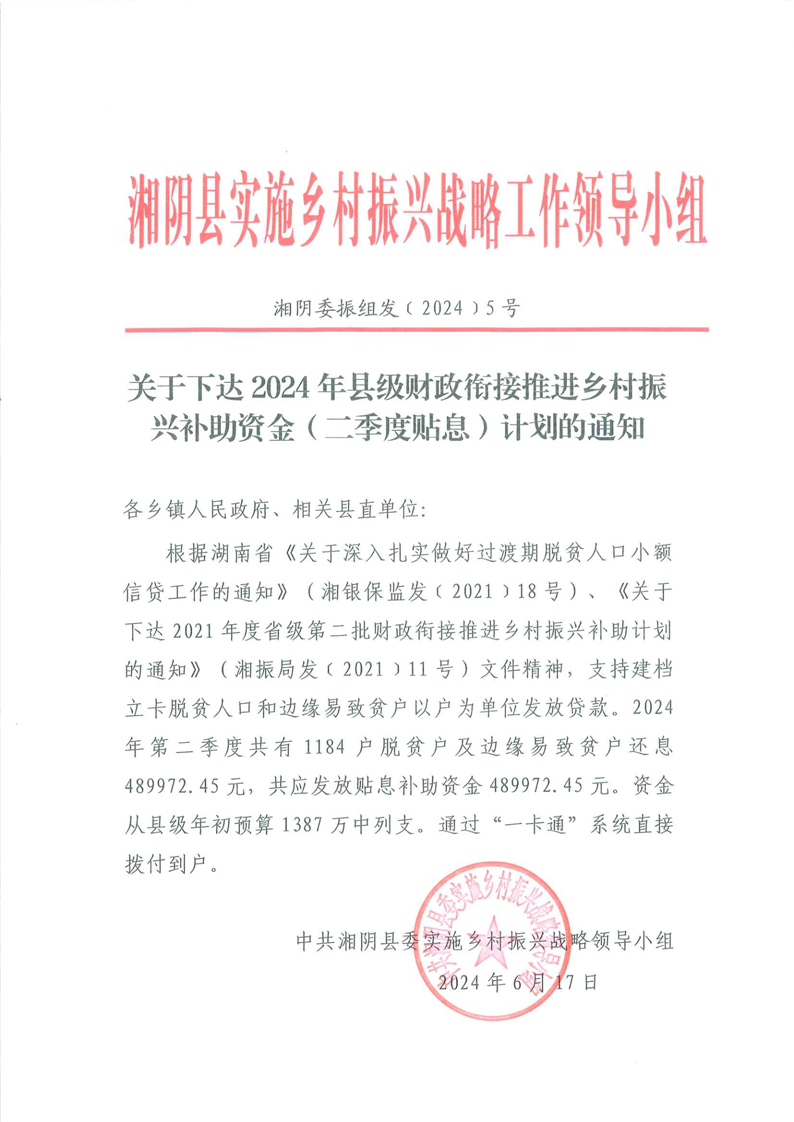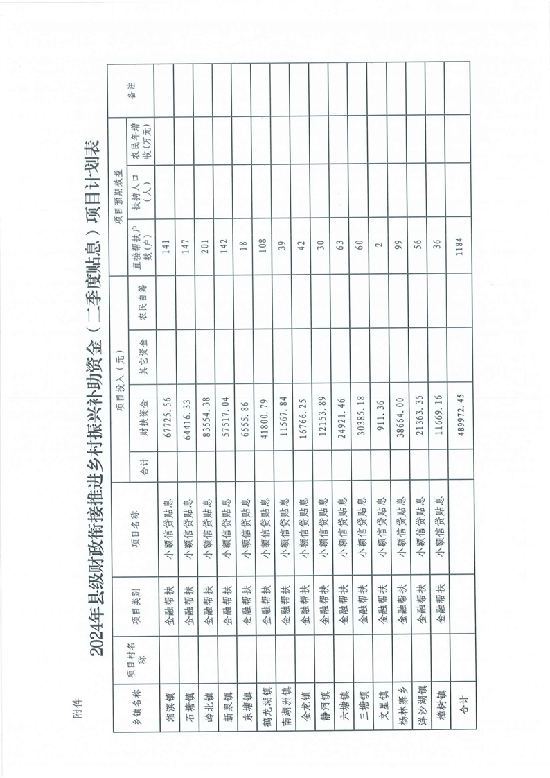 关于下达2024年县级财政衔接推进乡村振兴补助资金(二季度贴息)计划的通知