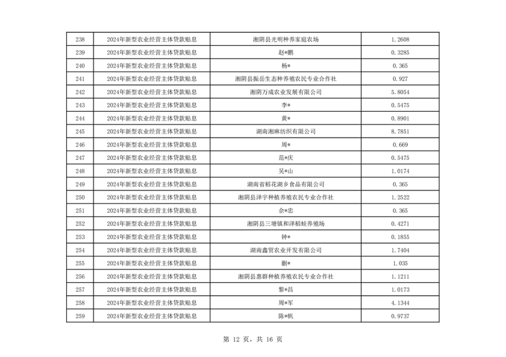 按照《关于印发新型农业经营主体贷款贴息工作实施方案的通知》(湘农联﹝2022﹞22号)文件精神,湖南省农业农村厅对县市区申报和市州审核的2024年度新型农业经营主体贷款贴息资料进行了抽查和汇总,于2025年9月11日下达了《关于下达2024年度新型农业经营主体贷款贴息明细的通知》,其中湘阴县有339家新型农业经营主体提交的资料通过了审核,共安排贷款贴息资金885.4382万元。