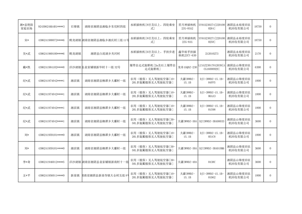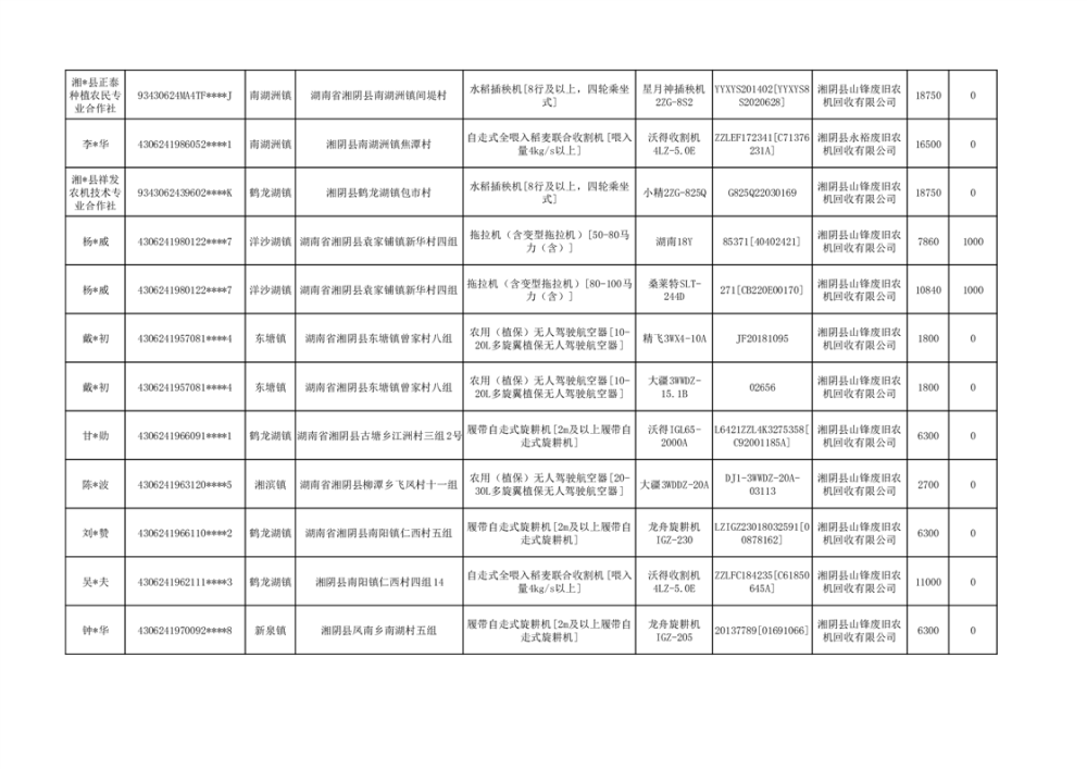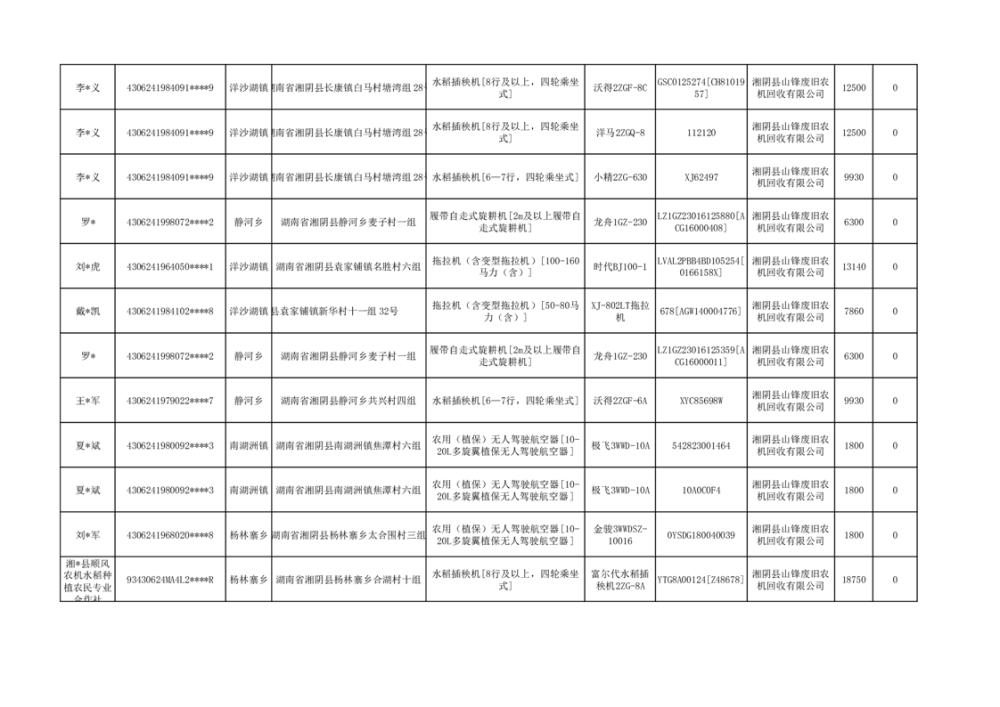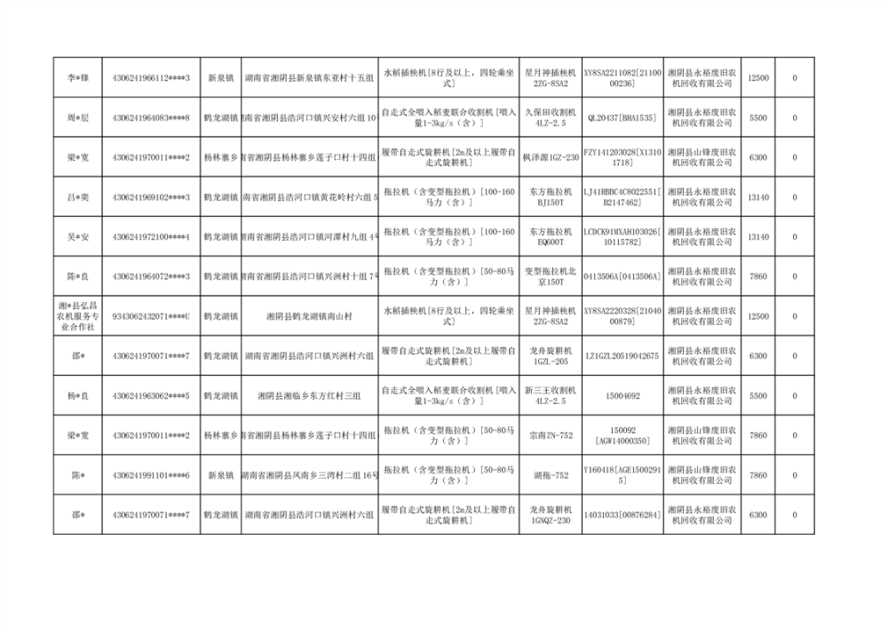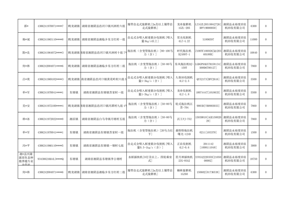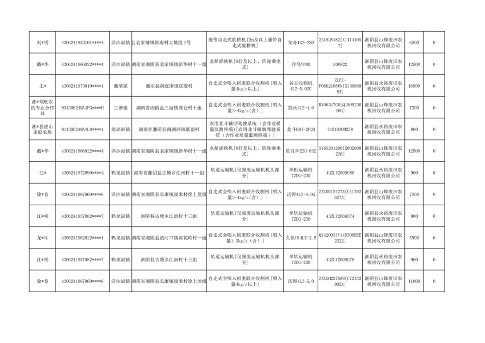 2024年湘阴县农机报废补贴资金公示(第四批)