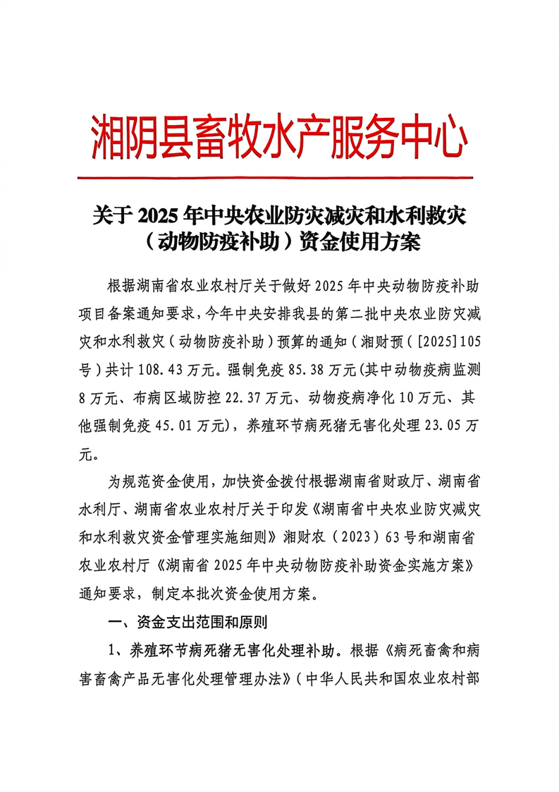 关于2025年中央农业防灾减灾和水利救灾(动物防疫补助)资金使用方案