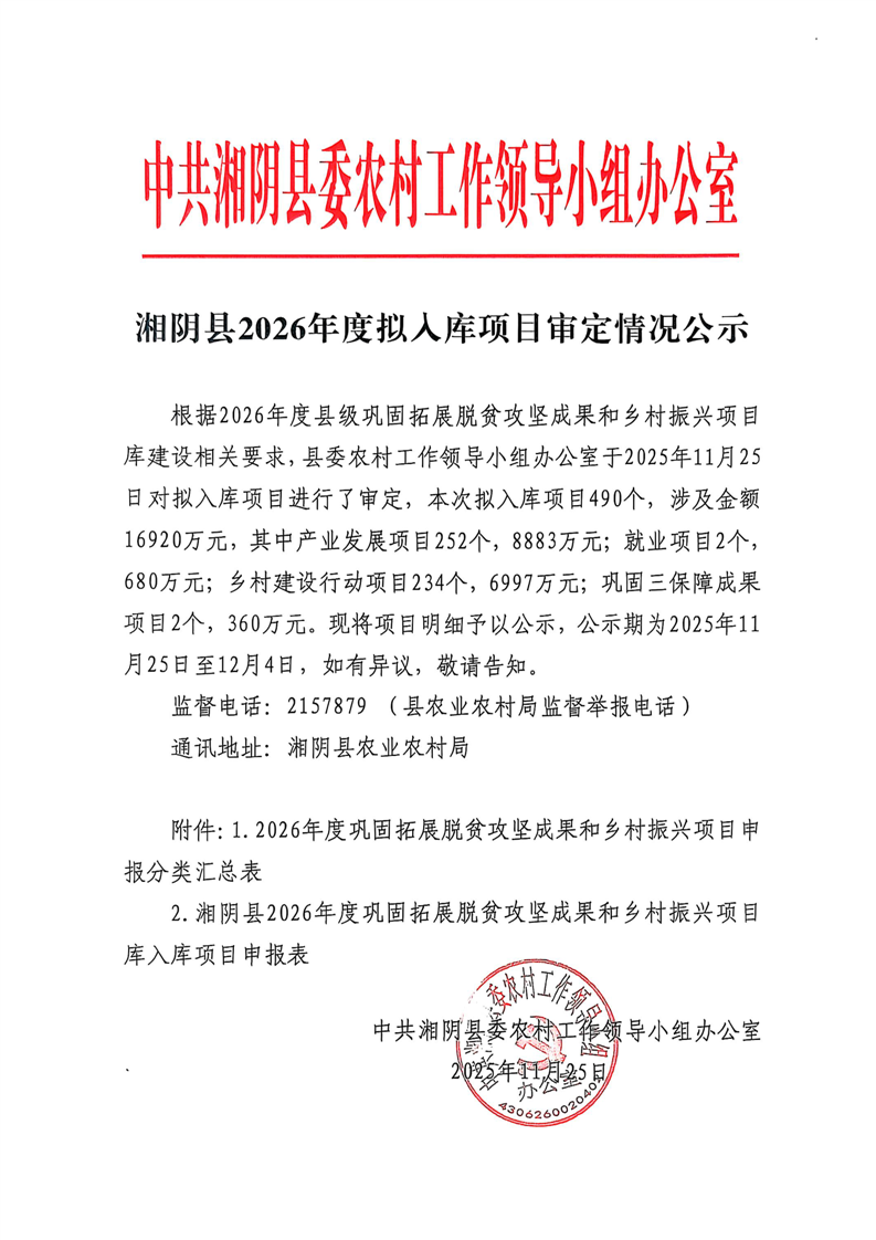 湘阴县2026年度拟入库项目审定情况公示