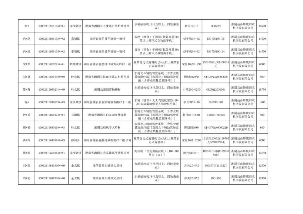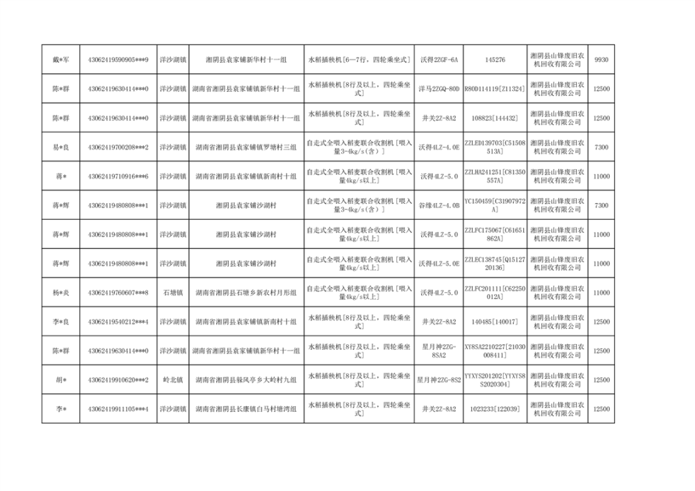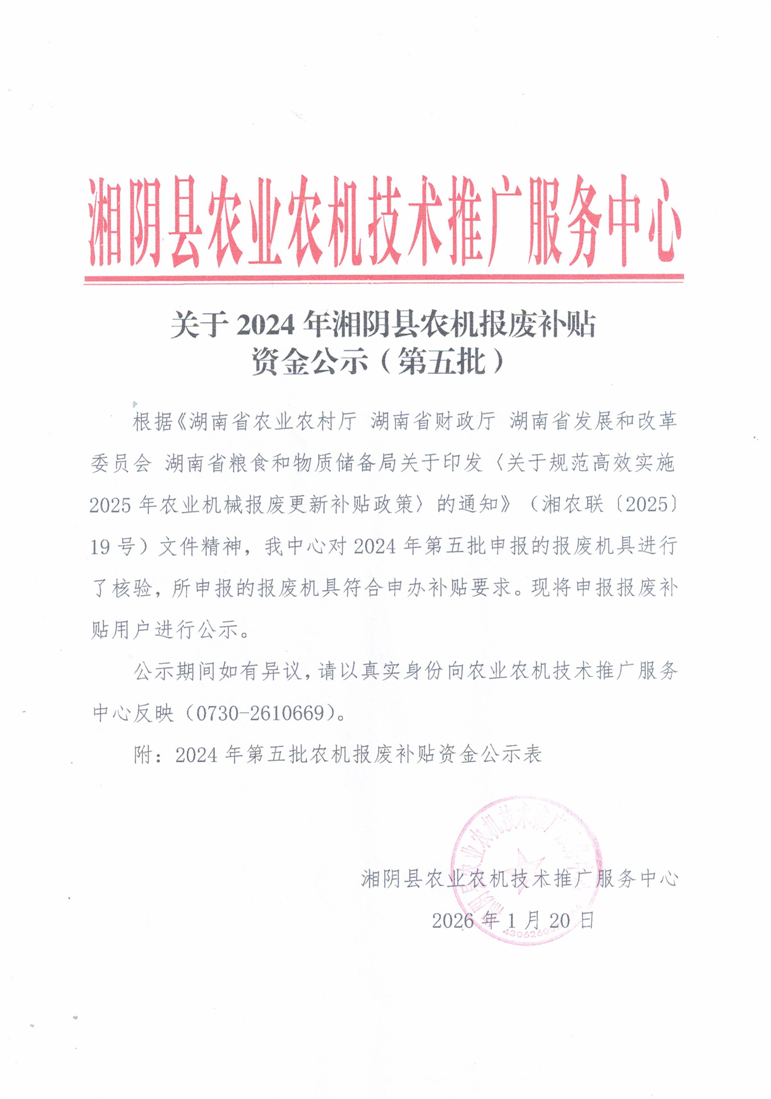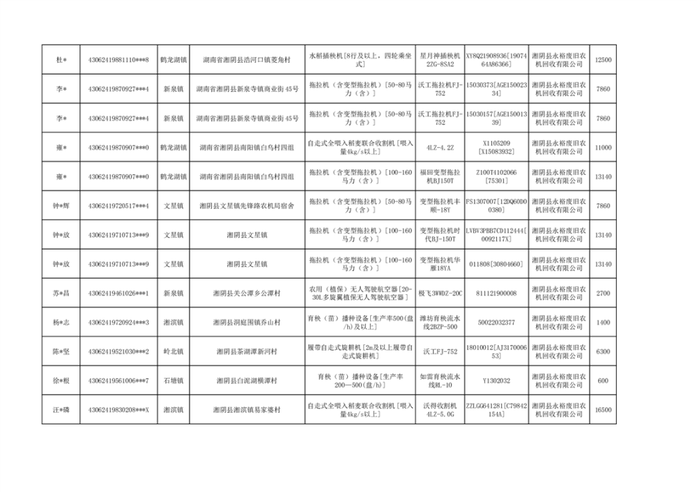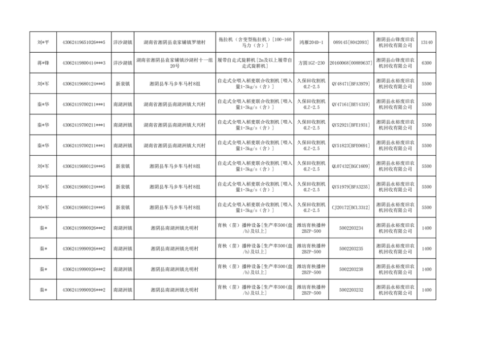 关于2024年湘阴县农机报废补贴资金公示(第五批)