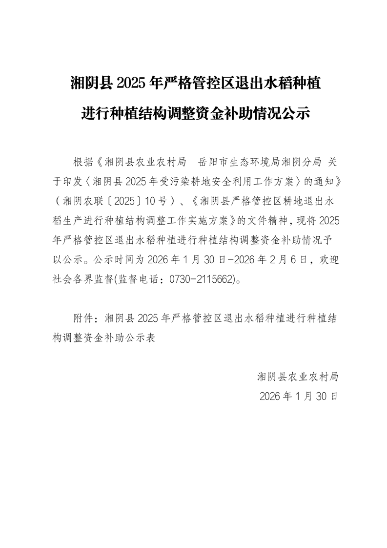 湘阴县2025年严格管控区退出水稻种植进行种植结构调整资金补助情况公示