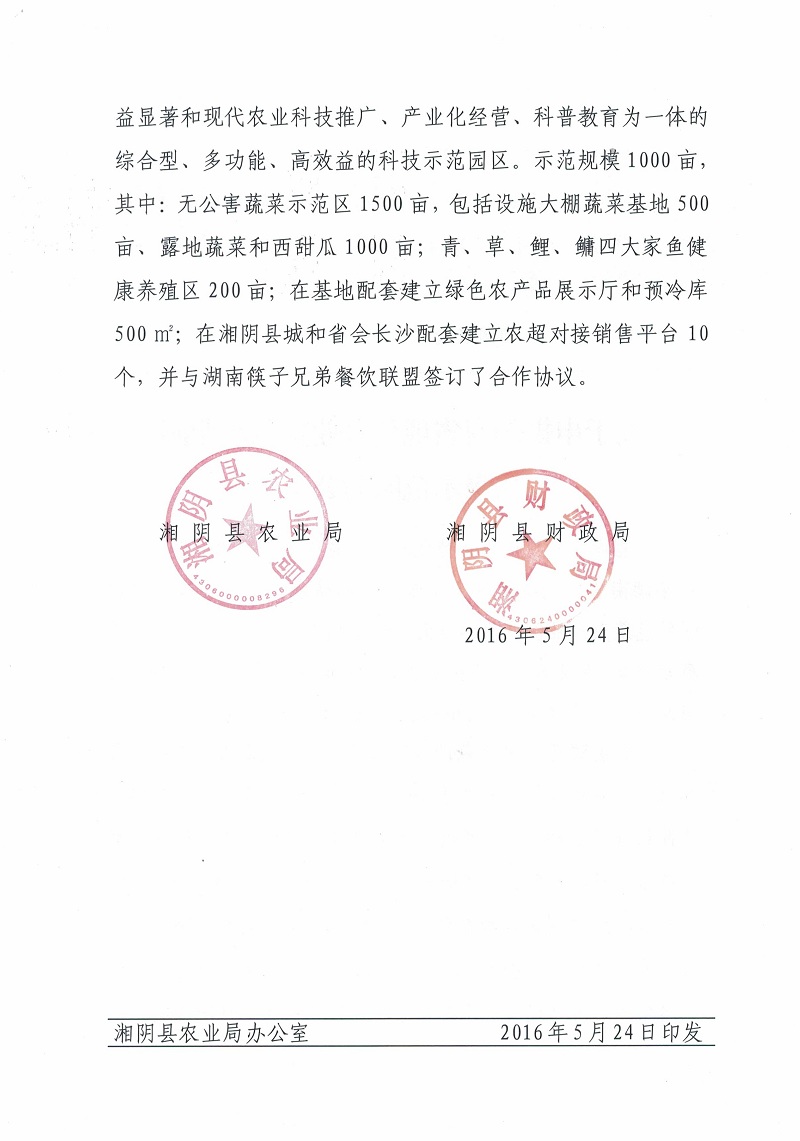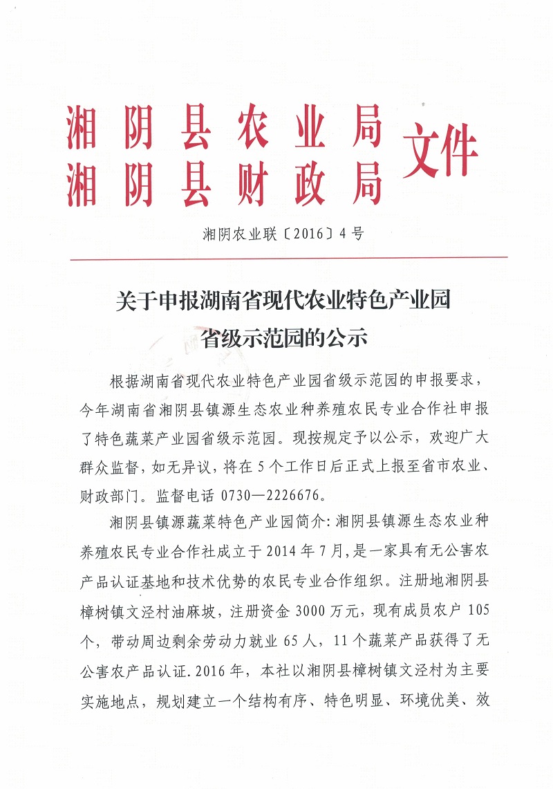 湘阴农业联(2016)4号 湘阴县农业局 湘阴县财政局 关于申报湖南省现化农业特色产业园省级示范园的公示