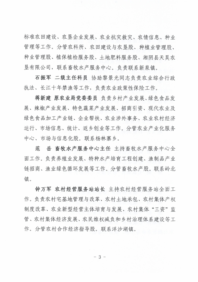 关于调整湘阴县农业农村局(乡村振兴局) 负责干部分工的通知