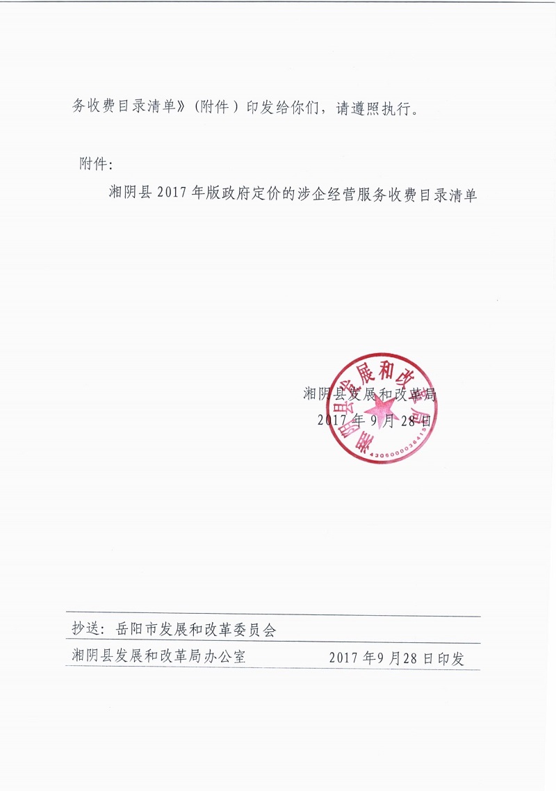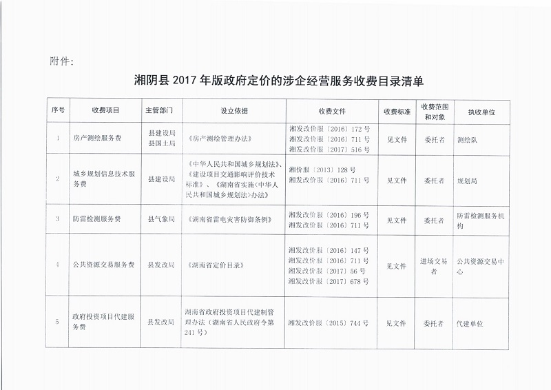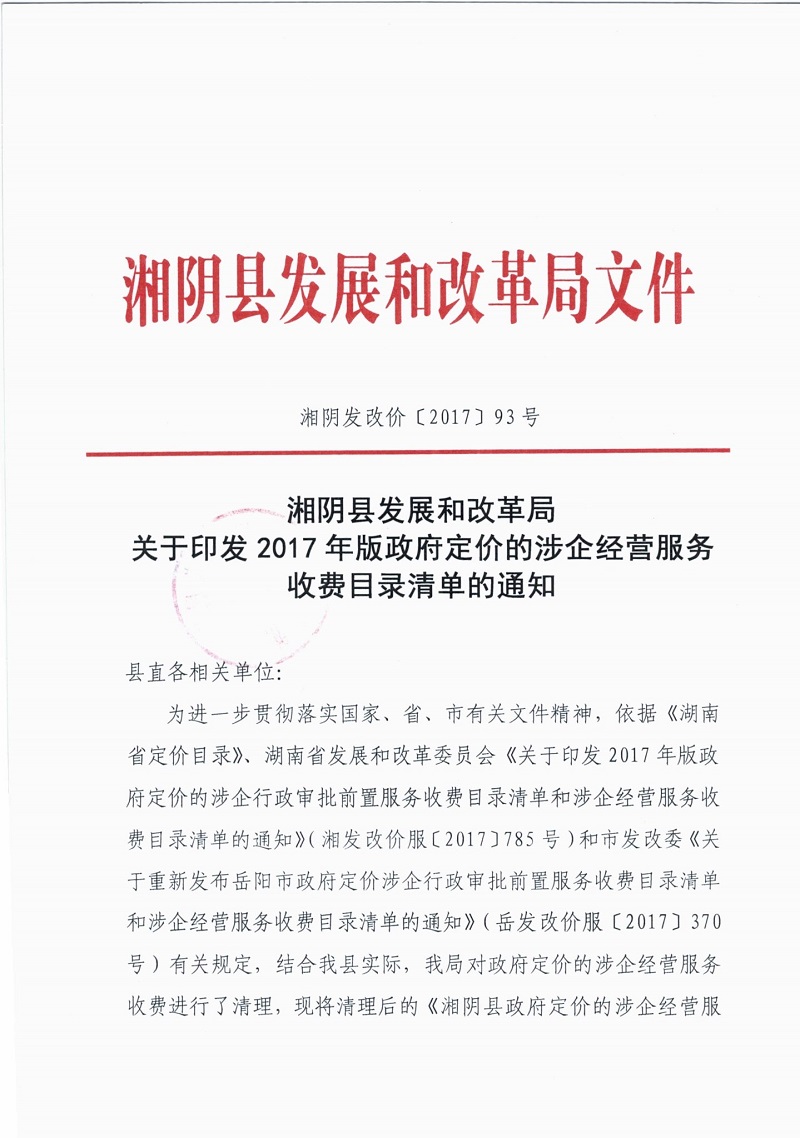 湘阴发改价【2017】93号 关于印发2017年版政府定价的涉企经营服务收费目录清单的通知