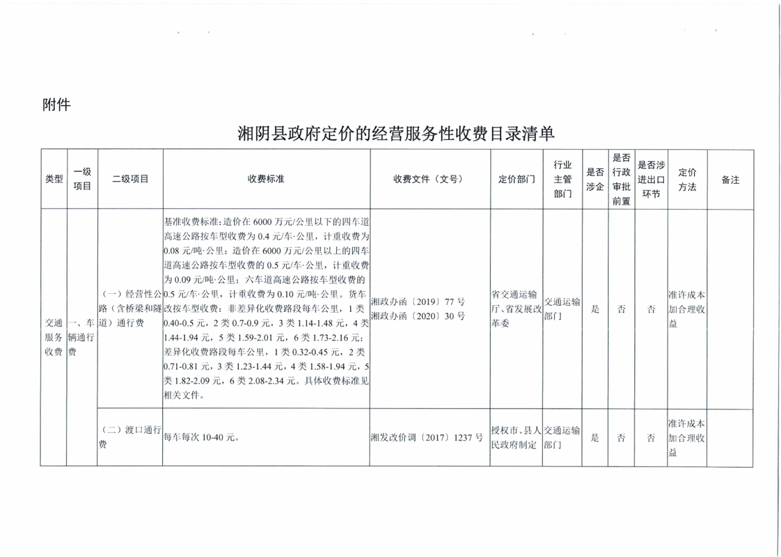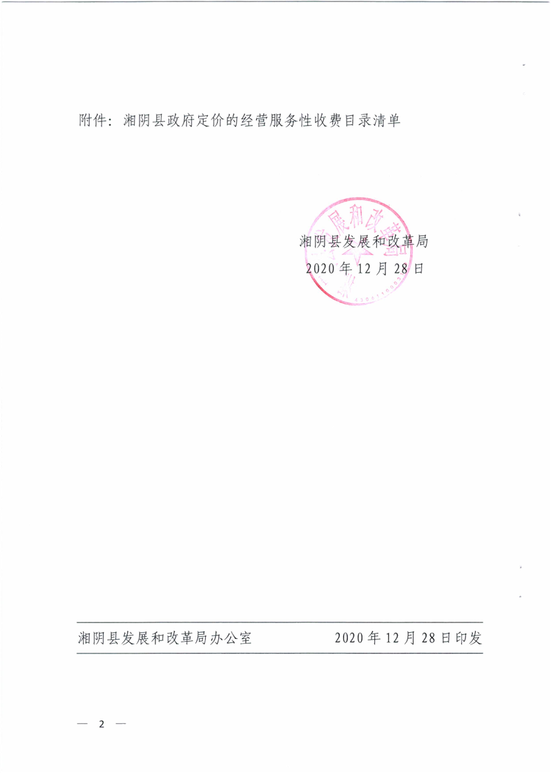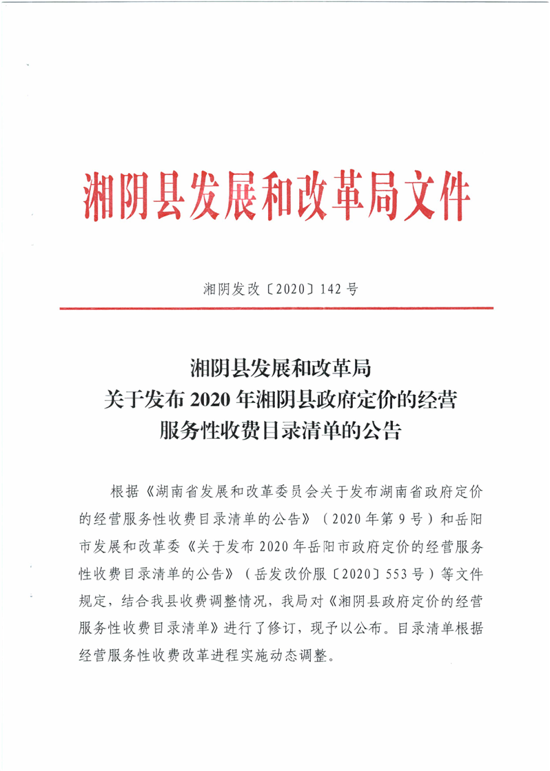 关于发布2020年湘阴县政府定价的经营服务性收费目录清单的公告