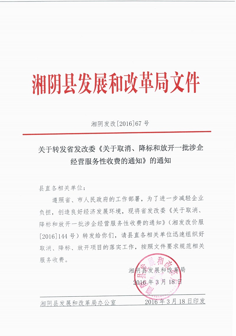 湘阴发改[2016]67号 关于转发省发改委《关于取消、降标和放开一批涉企经营服务性收费的通知》的通知