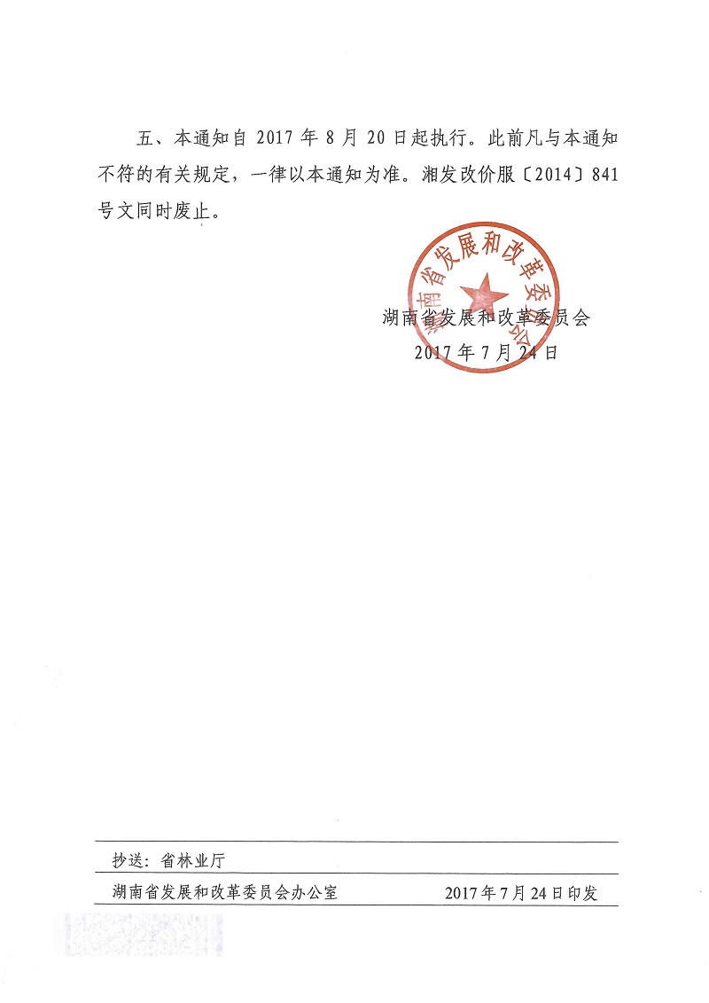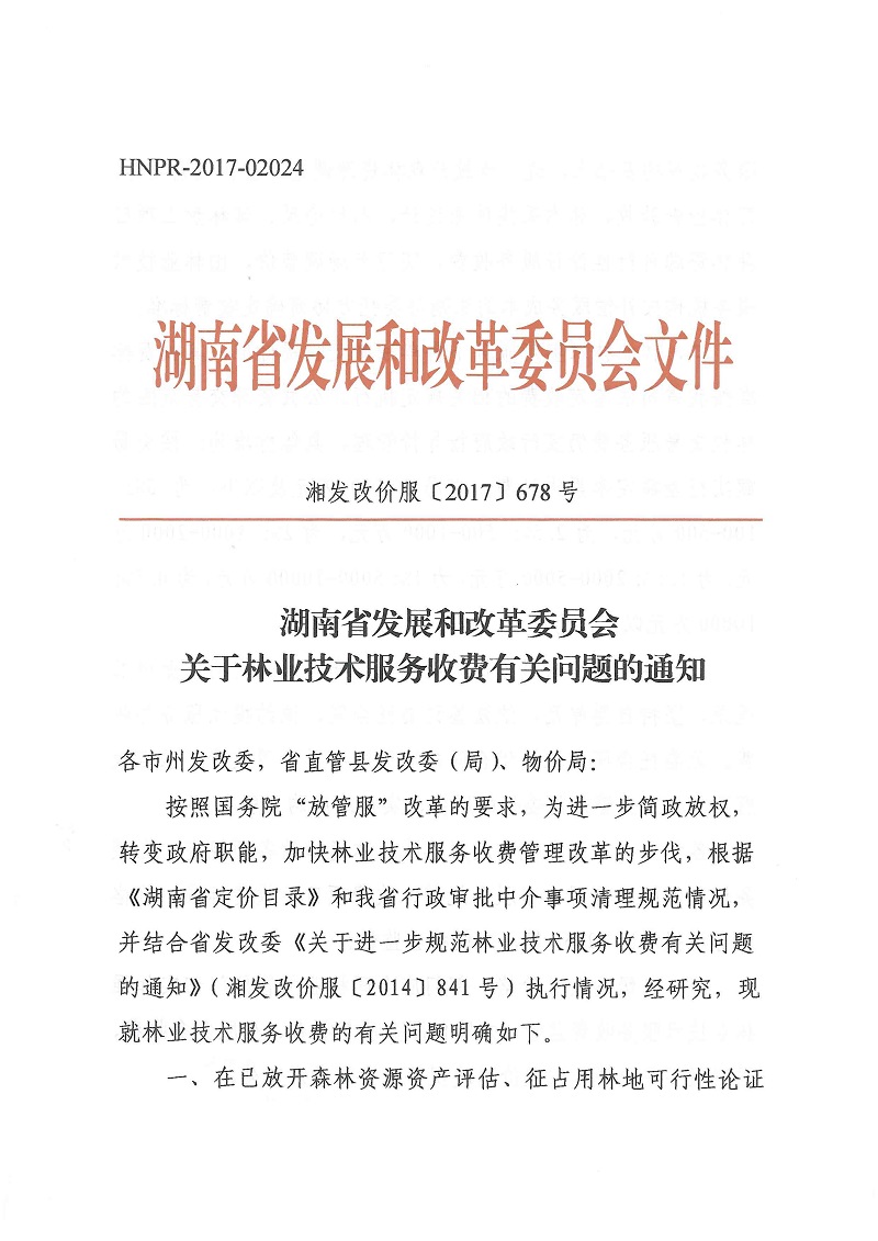 湘发改价服〔2017〕678号 关于林业技术服务收费有关问题的通知