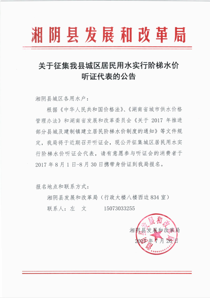 关于征集我县城区居民用水实行阶梯水价听证代表的公告