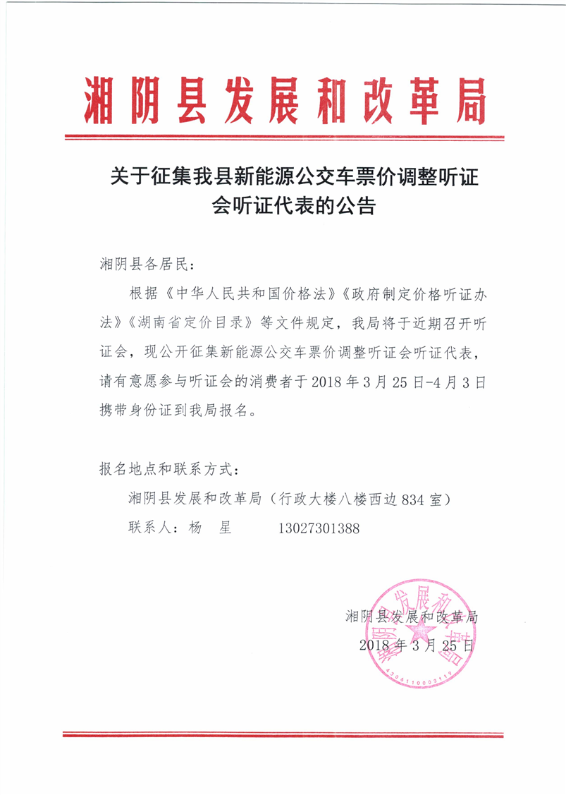 关于征集我县新能源公交车票价调整听证会听证代表的公告