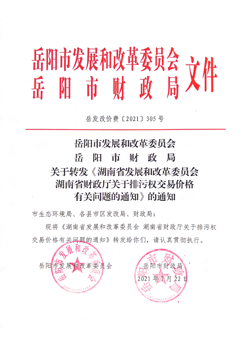 岳阳市发展和改革委员会 岳阳市财政局关于转发《湖南省发展和改革委员会湖南省财政厅关于,排污权交易价格有关问题的通知》的通知