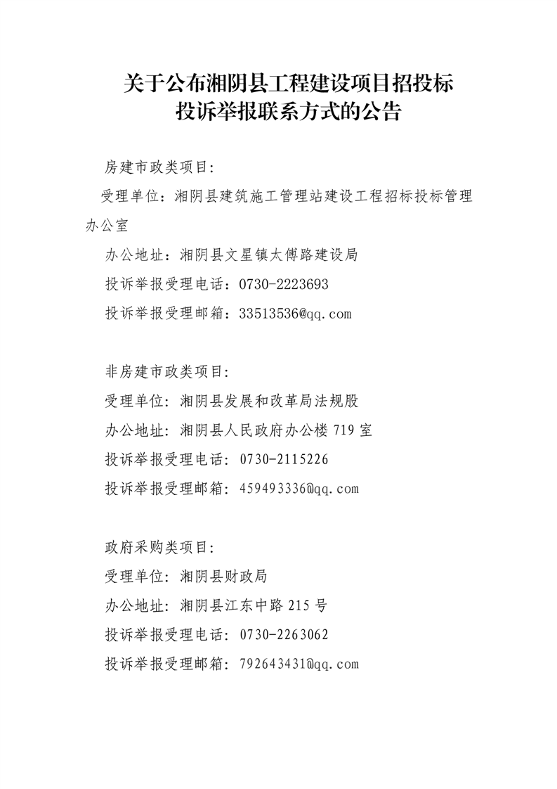 关于公布湘阴县工程建设项目招投标投诉举报联系方式的公告