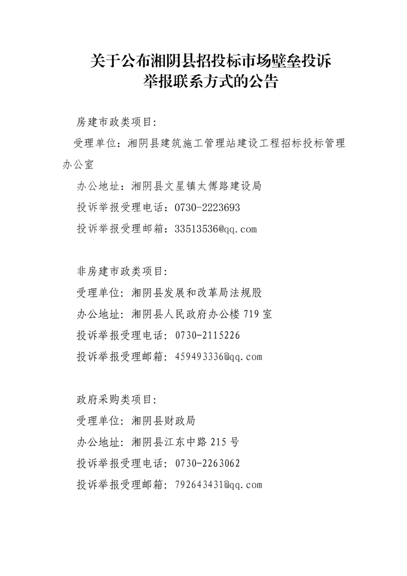 关于公布湘阴县招投标市场壁垒投诉举报联系方式的公告