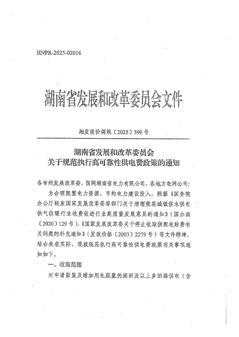 岳阳市发展和改革委员会 关于转发湖南省发展和改革委员会《关于规范执行高可靠性供电费政策的通知》的通知 岳发改价商〔2025〕256号
