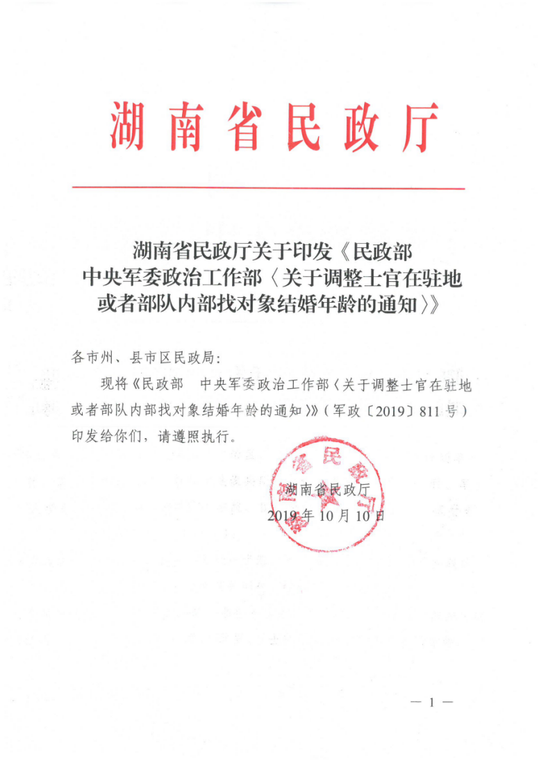 湖南省民政厅关于应发《民政部中央军委整治工作部〈关于调整士官在驻地或者部队内部找对象结婚年龄的通知〉》