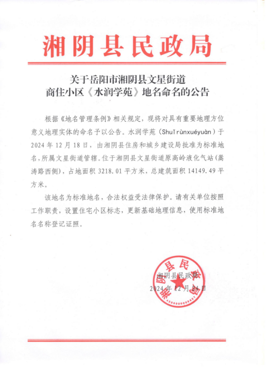 关于岳阳市湘阴县文星街道商住小区《水润学苑》地名命名的公告