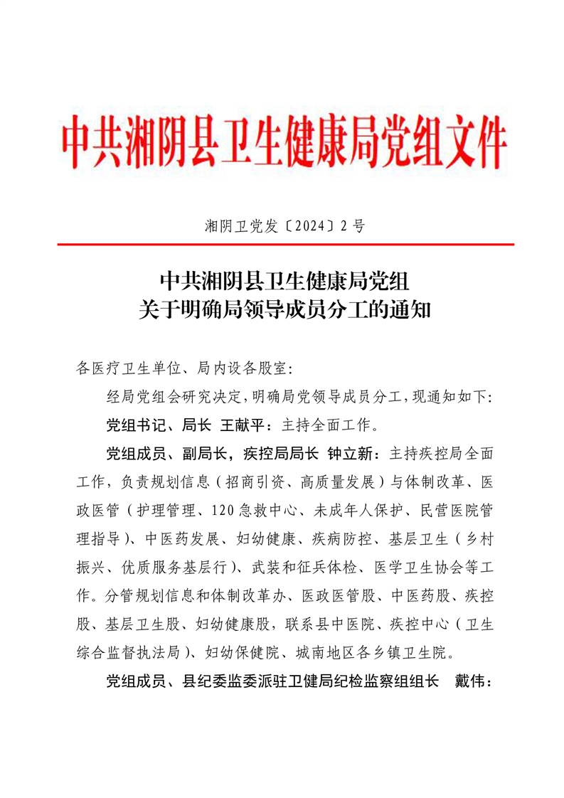 湘阴卫党发〔2024〕2号 关于明确局领导成员分工的通知