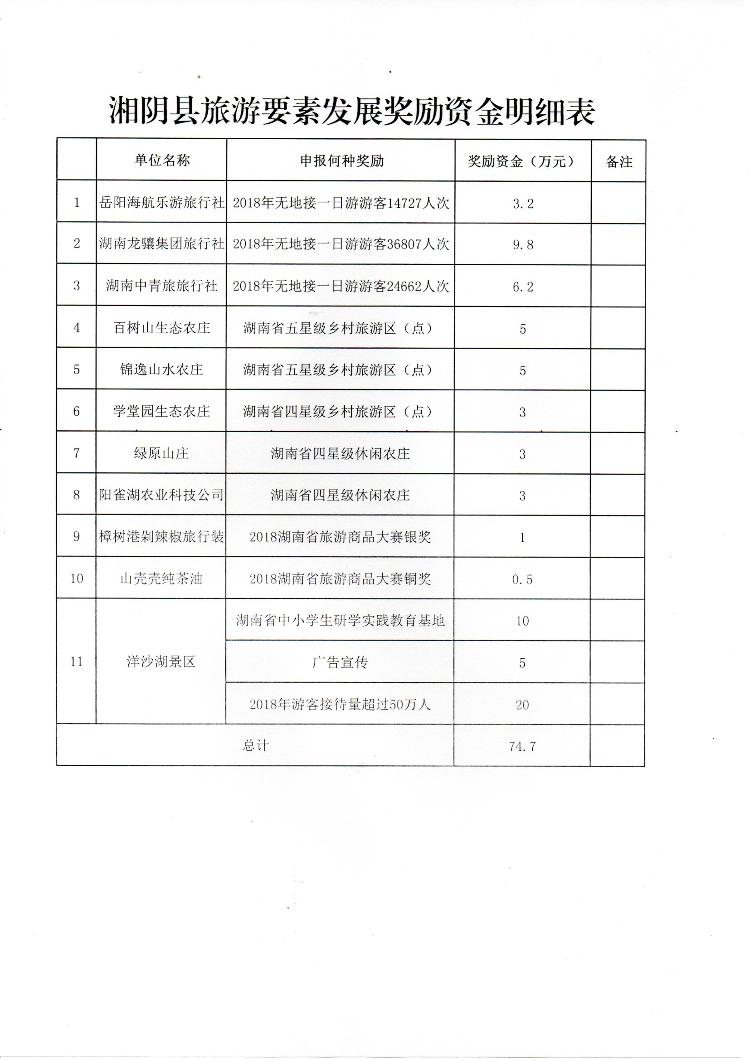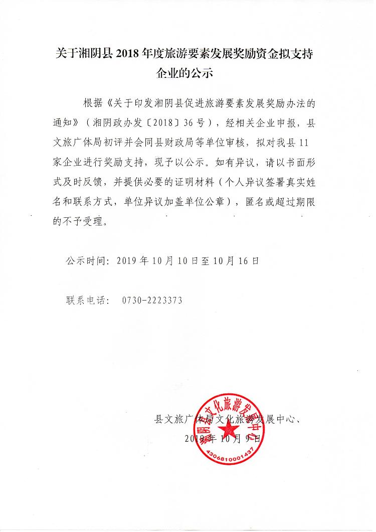关于湘阴县2018年度旅游要素发展奖励资金拟支持企业的公示