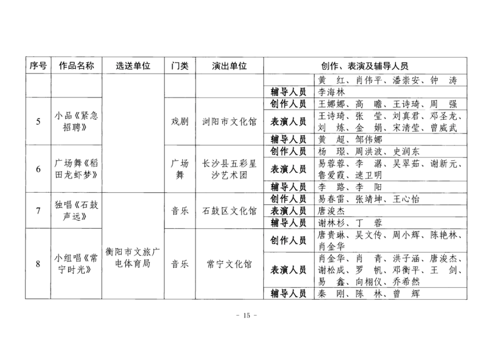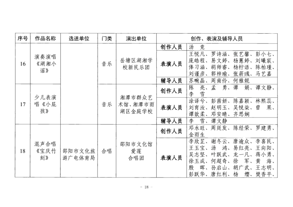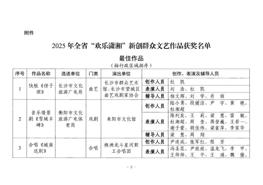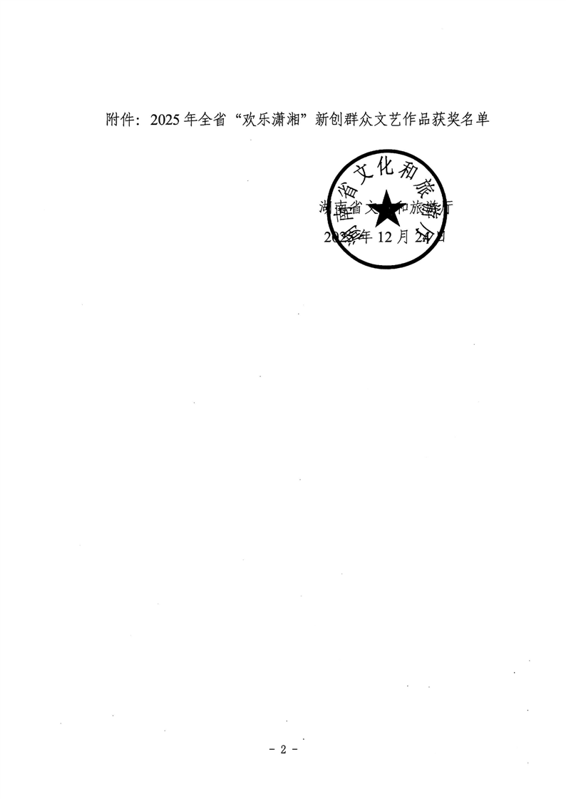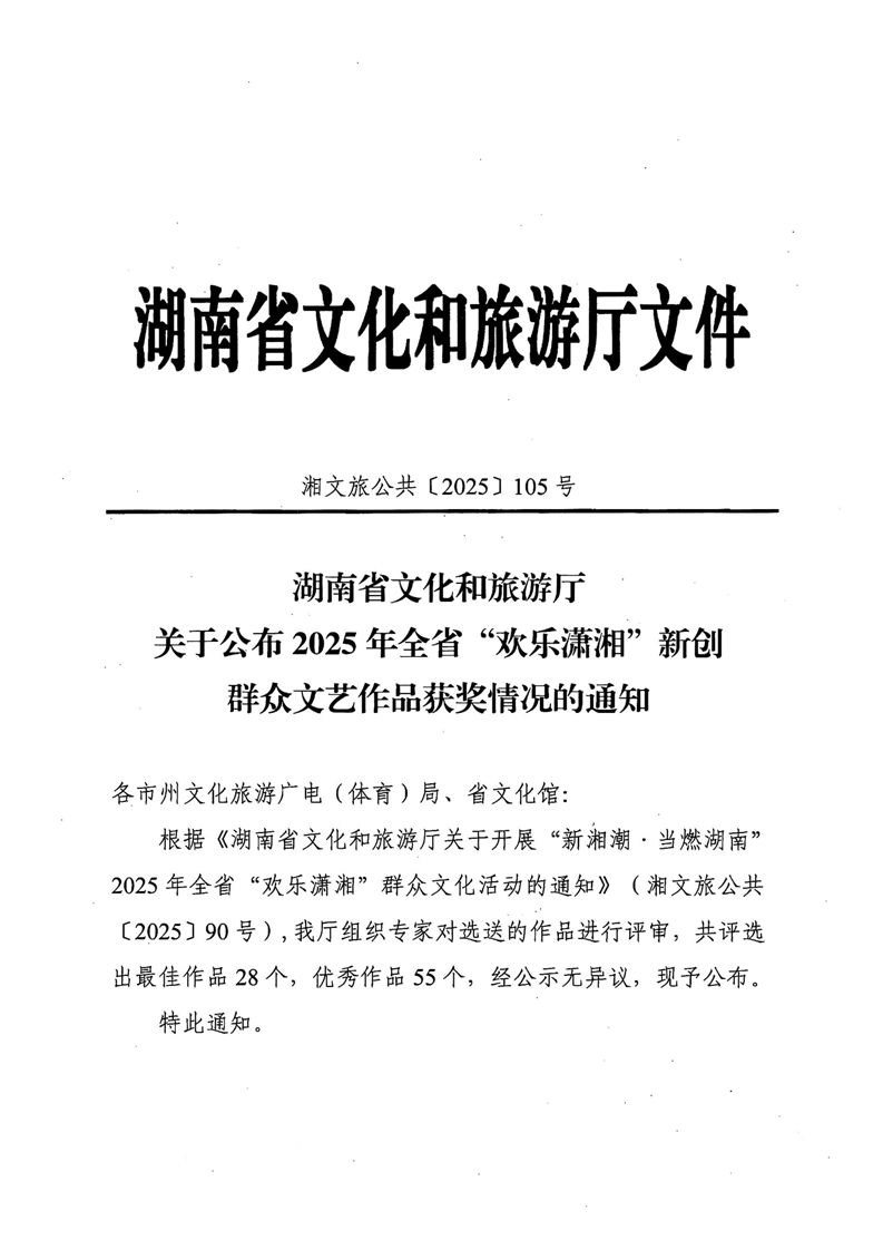 湖南省文化和旅游厅关于公布2025年全省“欢乐潇湘”新创群众文艺作品获奖情况的通知