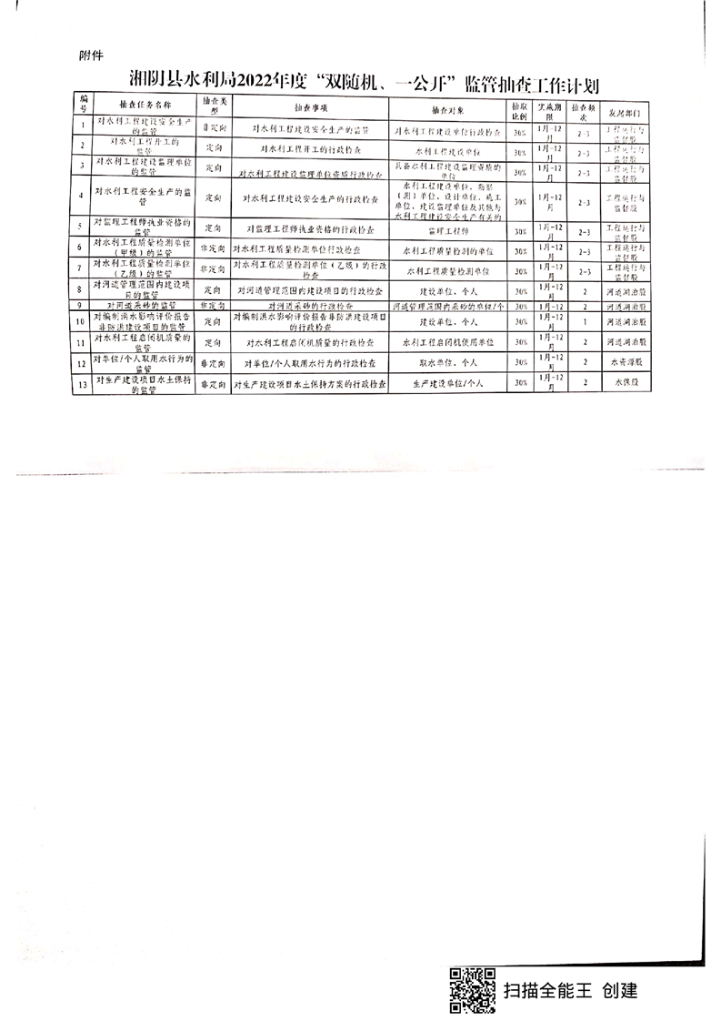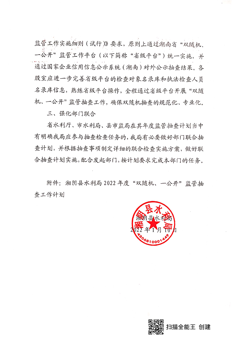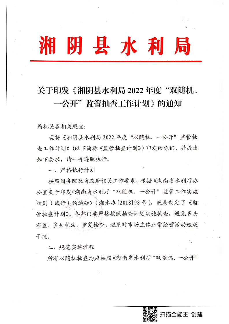 关于印发《湘阴县水利局2022年度“双随机、一公开”监管抽查工作计划》的通知