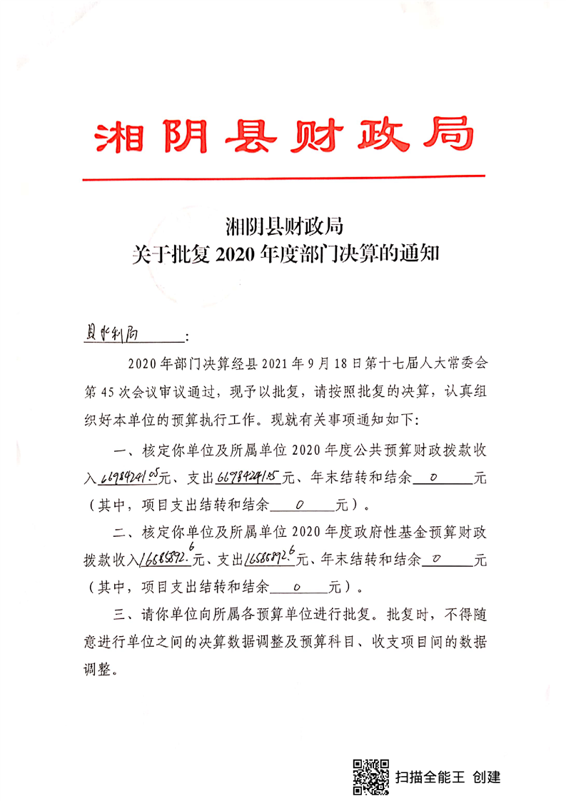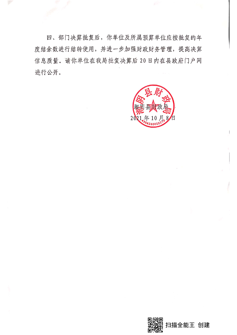 湘阴县财政局关于批复2020年度部门决算的通知