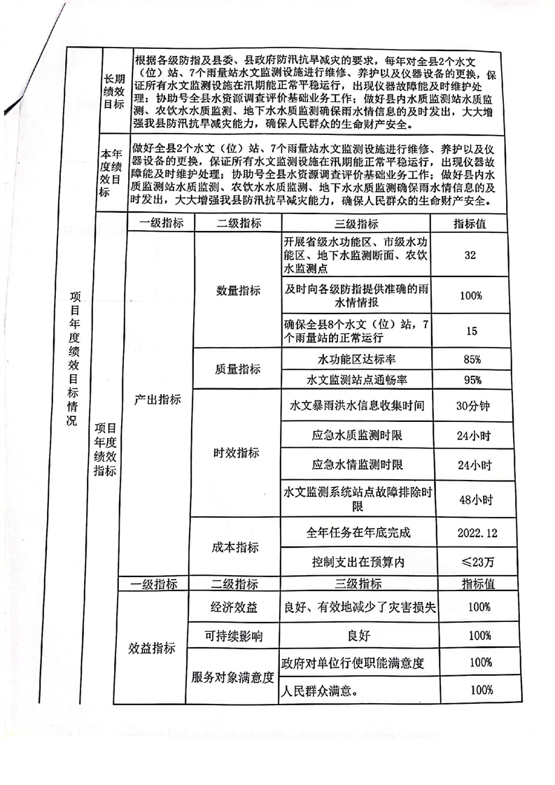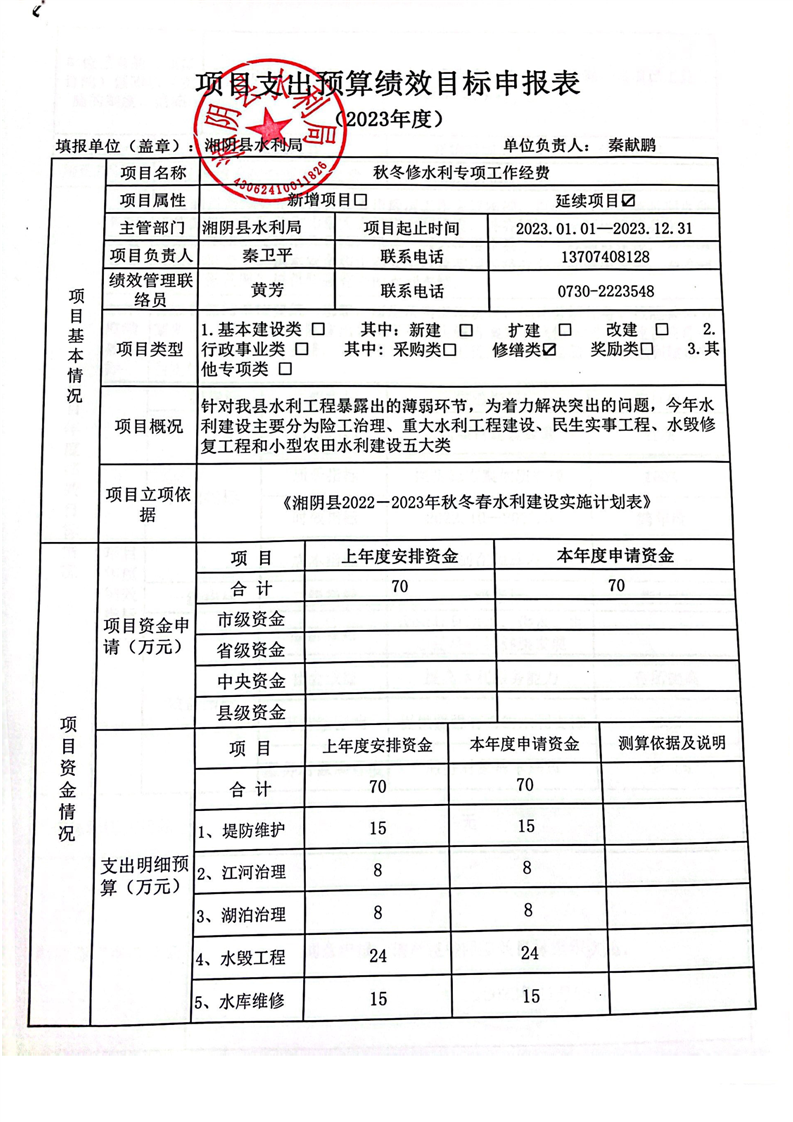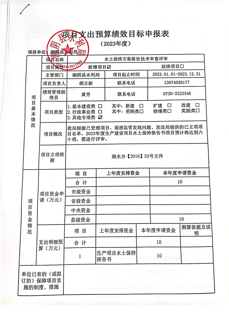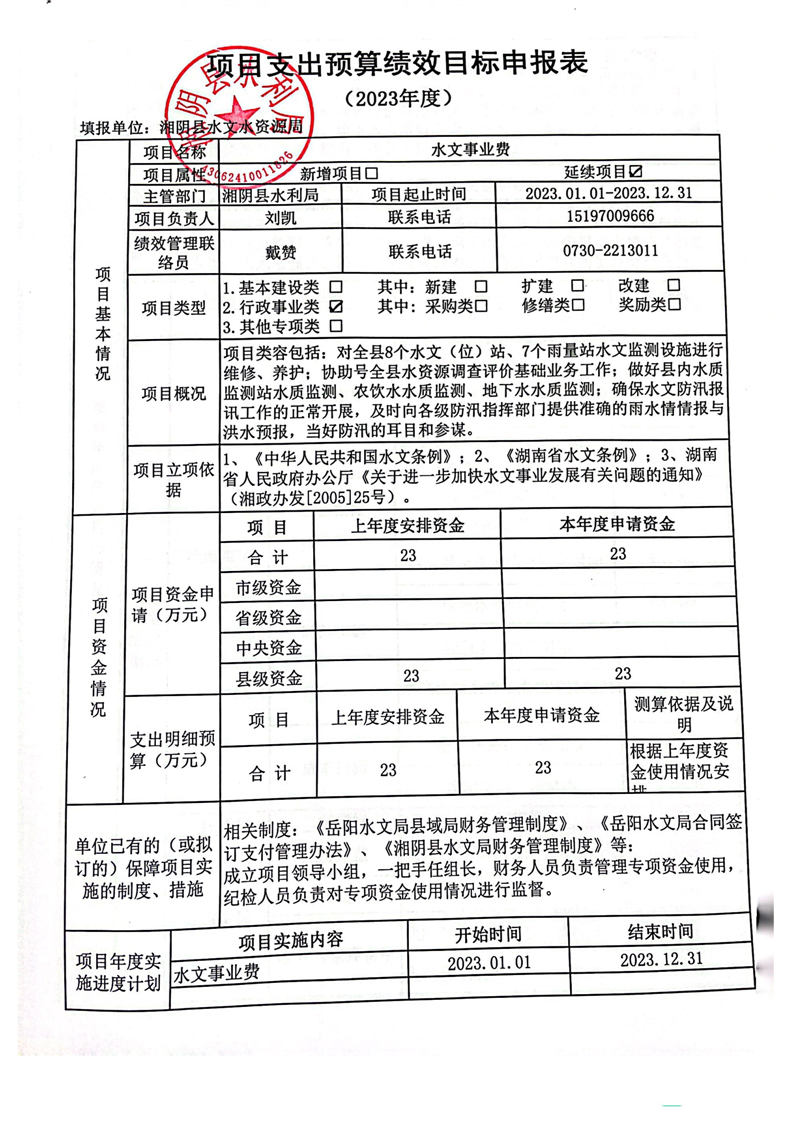 2023年度湘阴县水利局财政专项项目预算绩效目标申报表