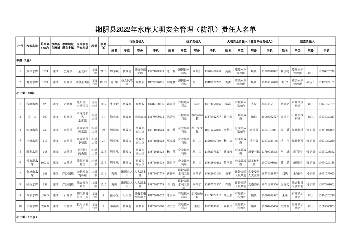 为全面落实2022年度小型水库大坝安全责任制,保障工程安全运行,现将我县115座小型水库大坝安全管理(防汛)责任人名单予以公布。请相关单位抓紧开展宣传培训,保证各类责任人尽快熟悉职责要求和业务知识。各类责任人要迅速熟悉情况,掌握履职要求并及时认真履职,要坚持24小时打开已公布的联系电话,接受上级相关部门的履职抽查。