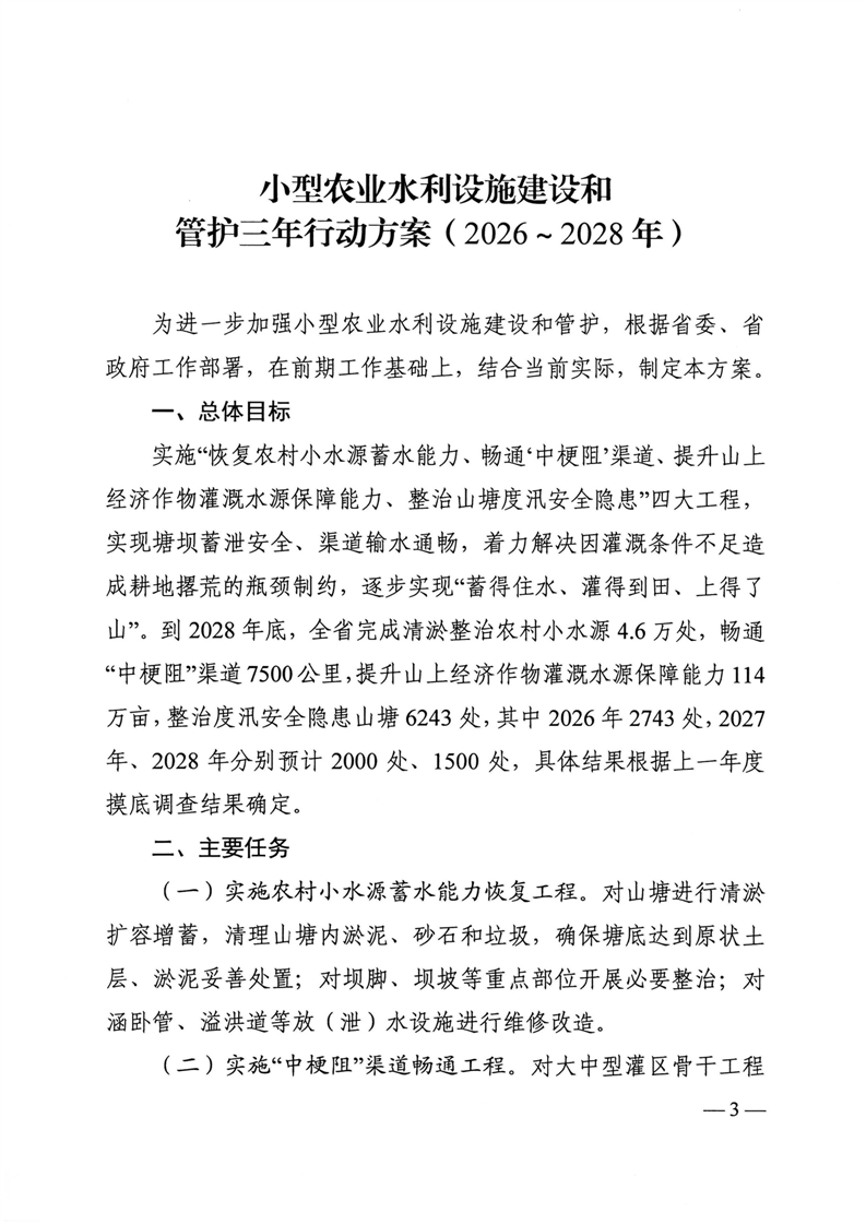 关于印发《小型农业水利设施建设和管护三年行动方案(2026-2028年)》的通知