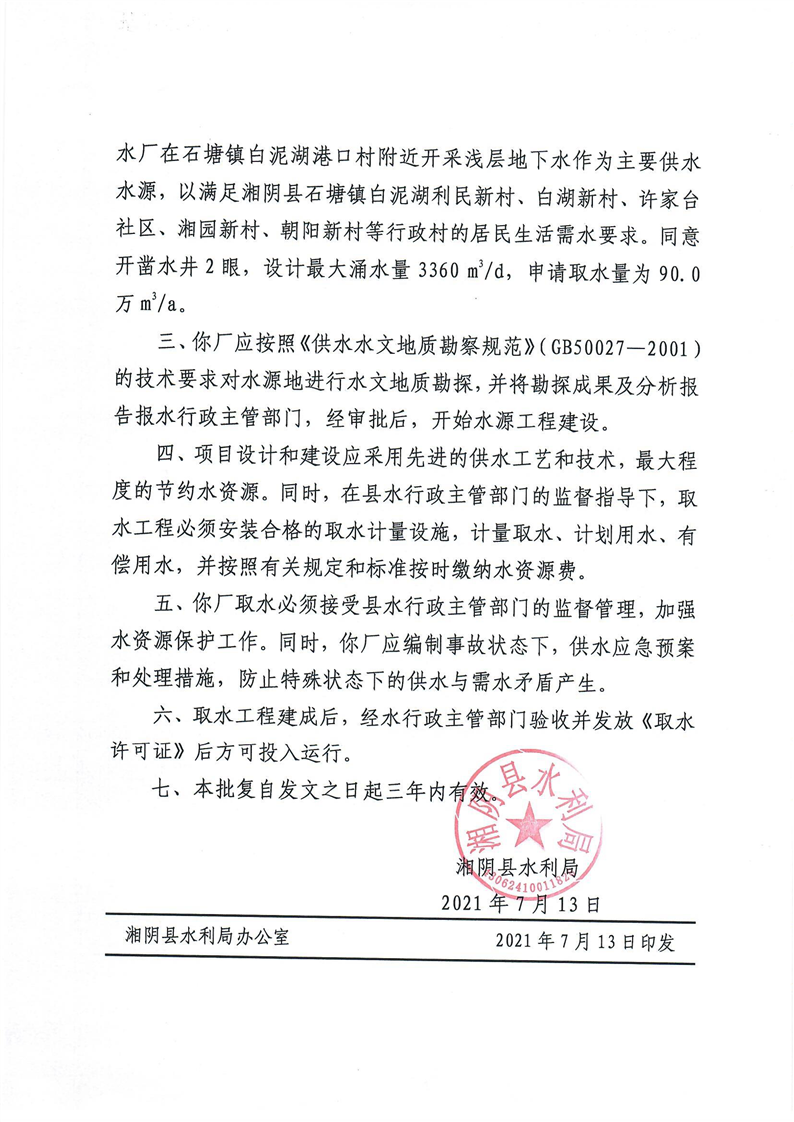 关于湘阴县白泥湖水厂取水许可申请的批复