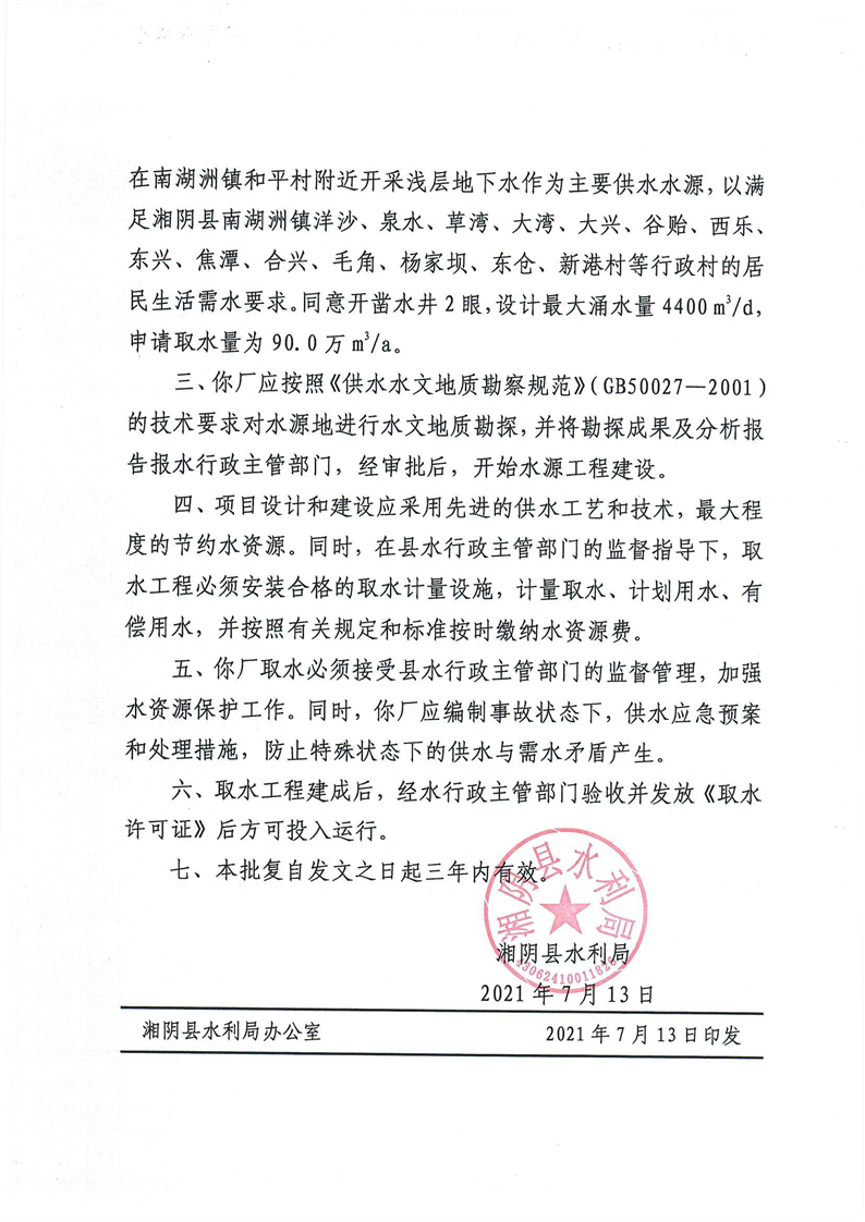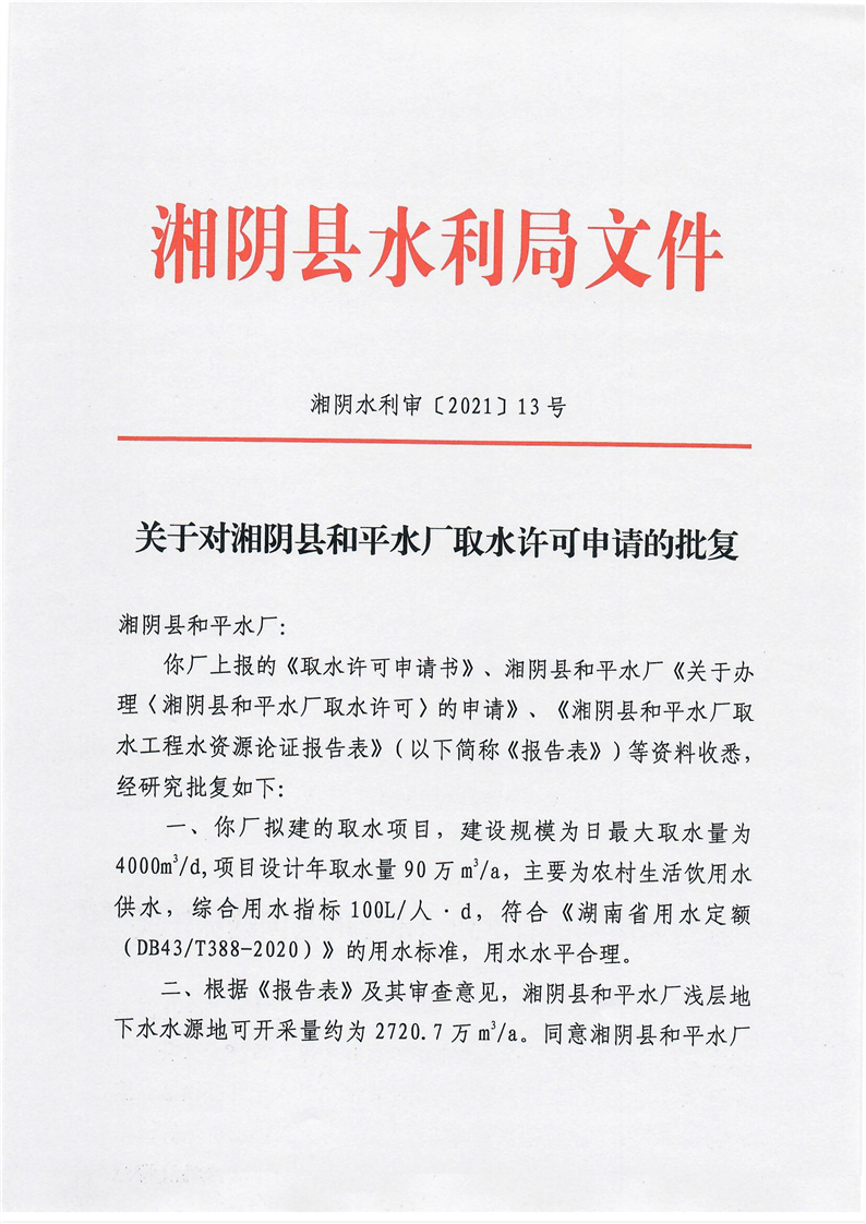 关于对湘阴县和平水厂取水许可申请的批复