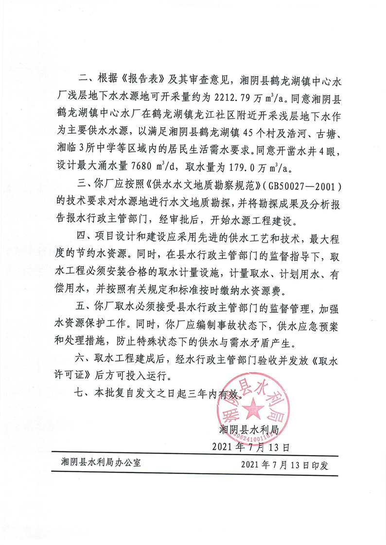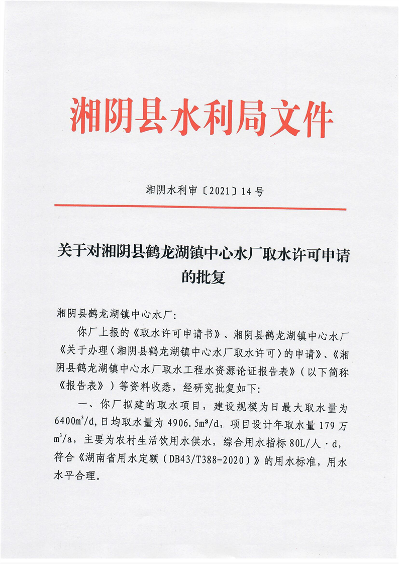关于对湘阴县鹤龙湖中心水厂取水许可申请的批复