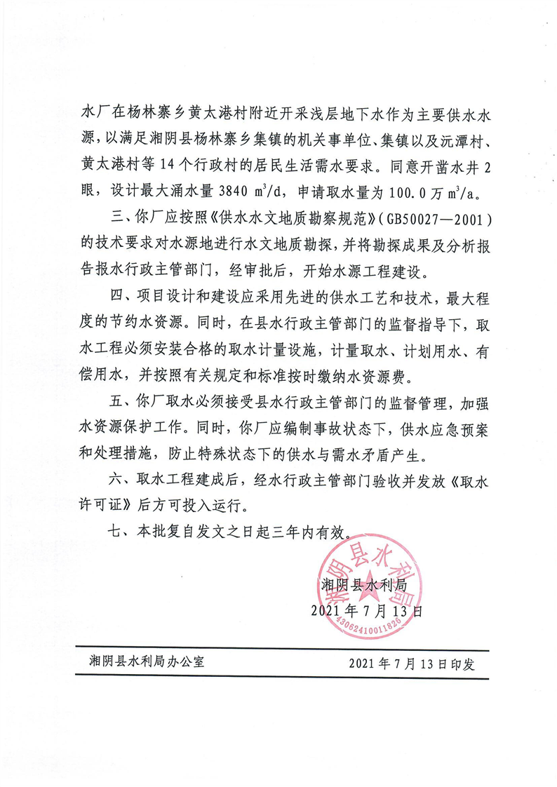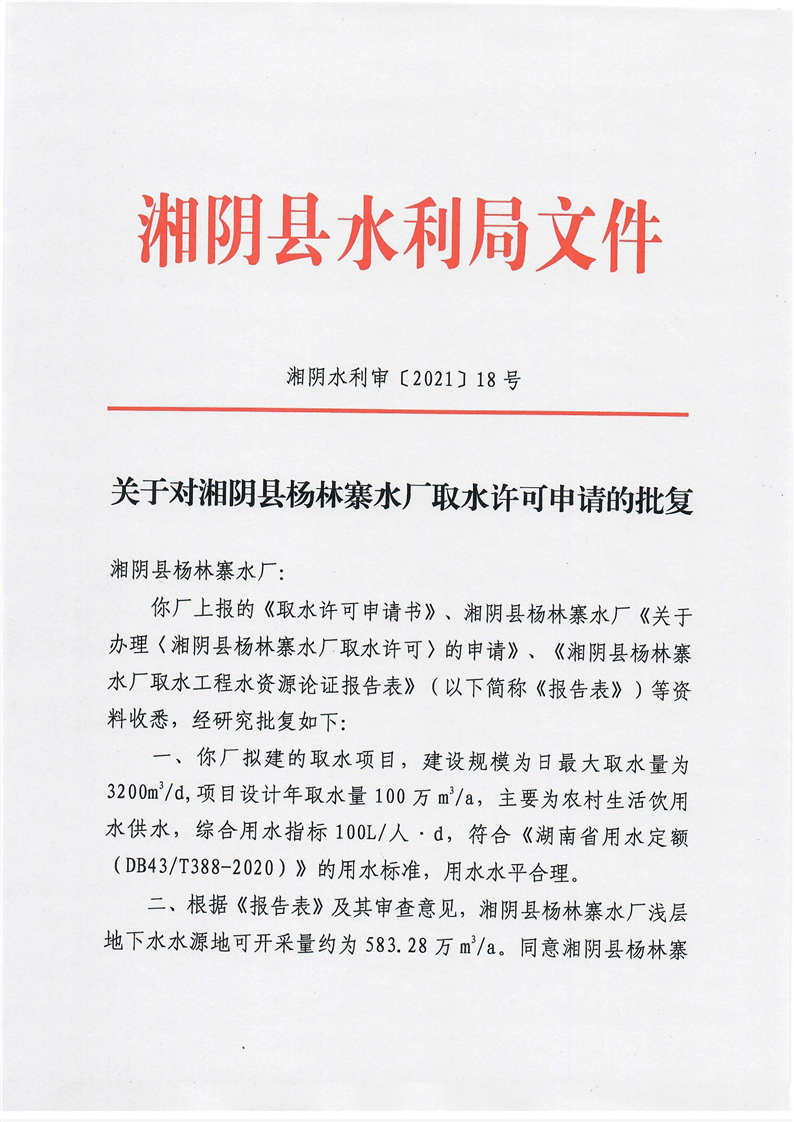 关于对湘阴县杨林寨水厂取水许可申请的批复