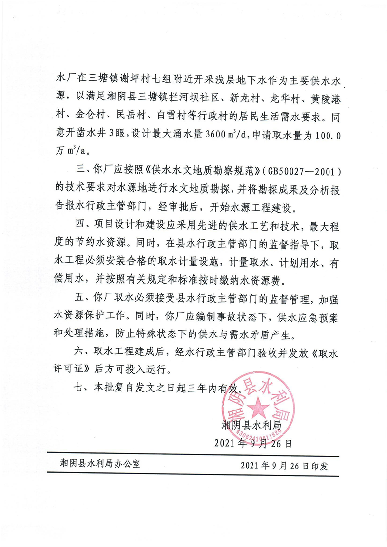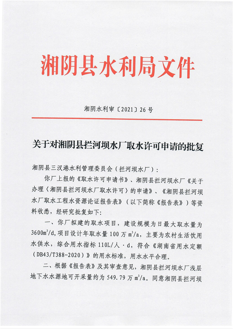 关于对湘阴县拦河坝水厂取水许申请的批复