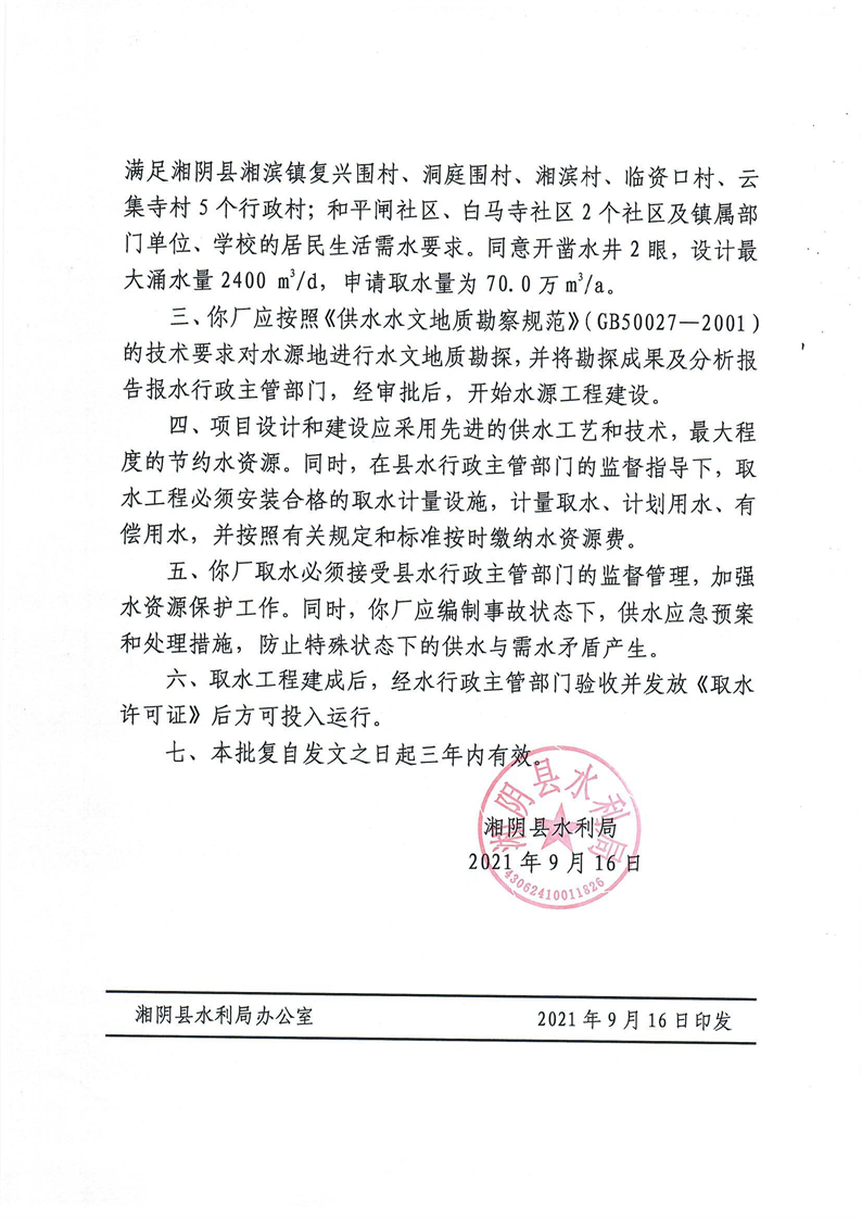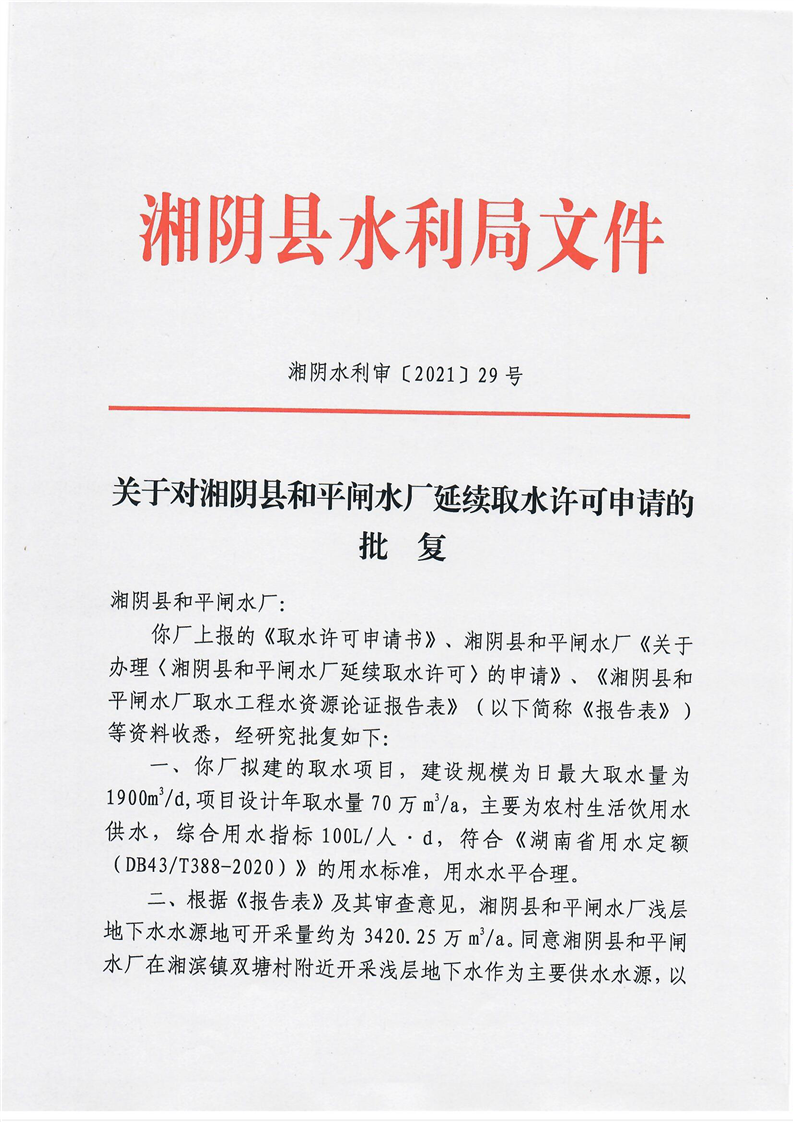 关于对湘阴县和平闸水厂延续取水许申请的批复