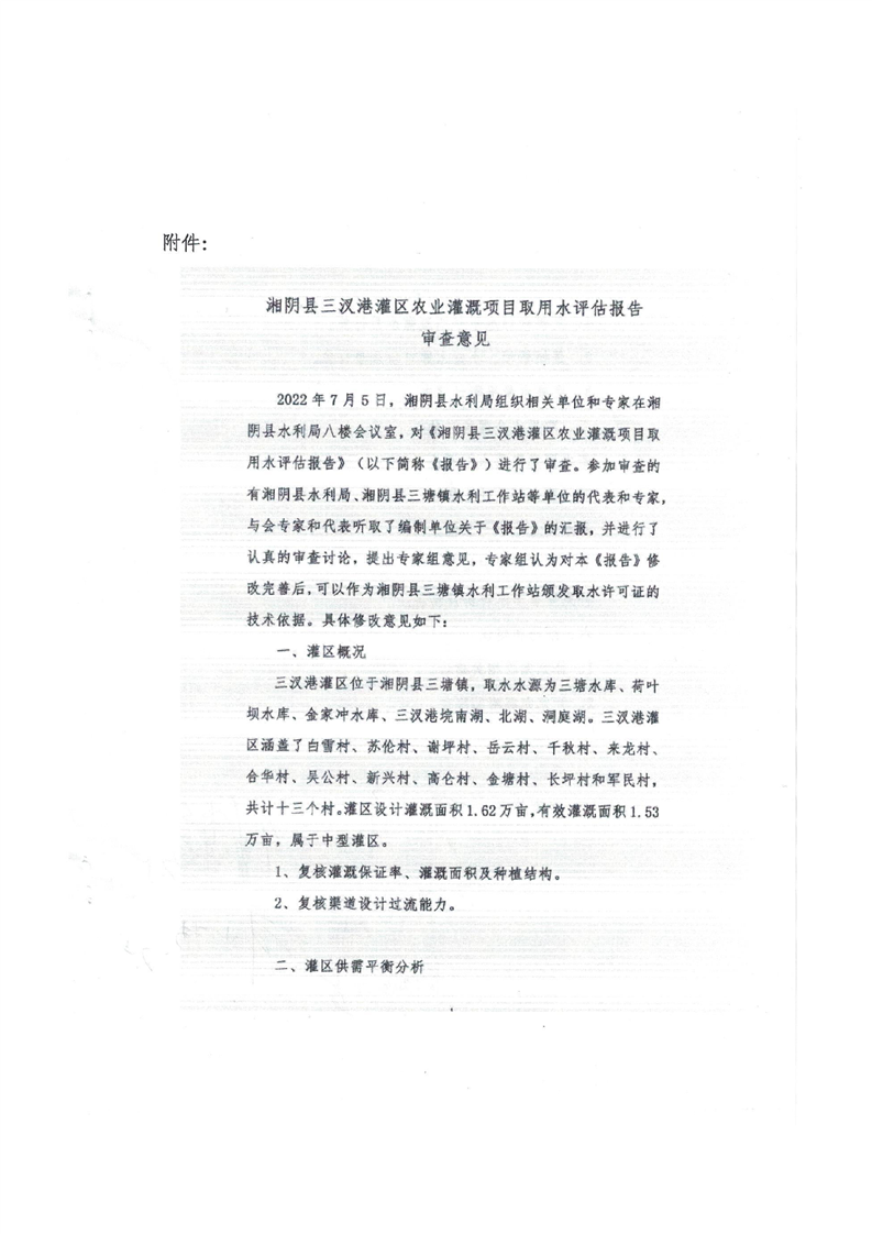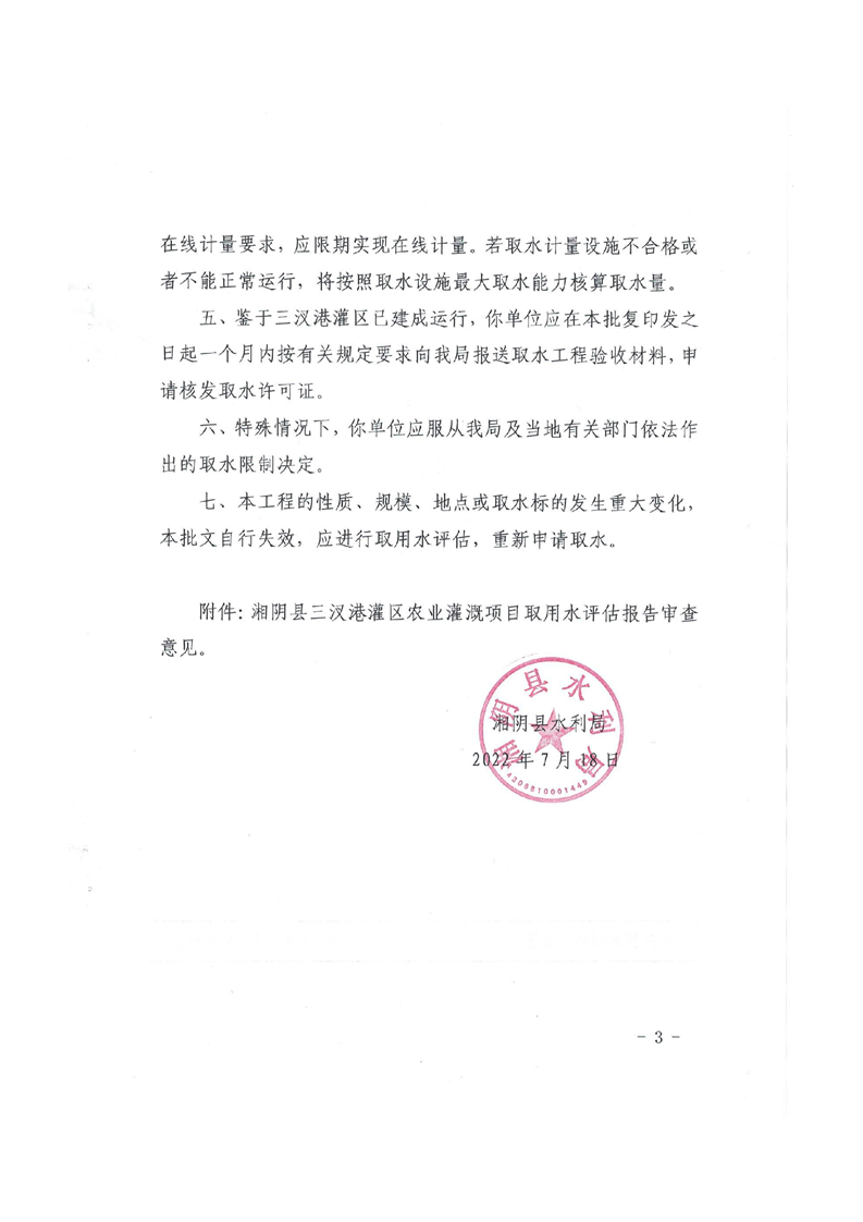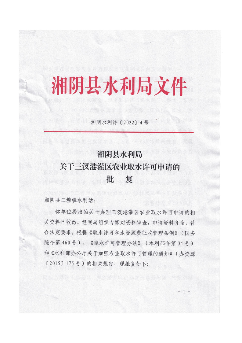 湘阴县水利局关于三汊港灌区农业取水许可申请的批复
