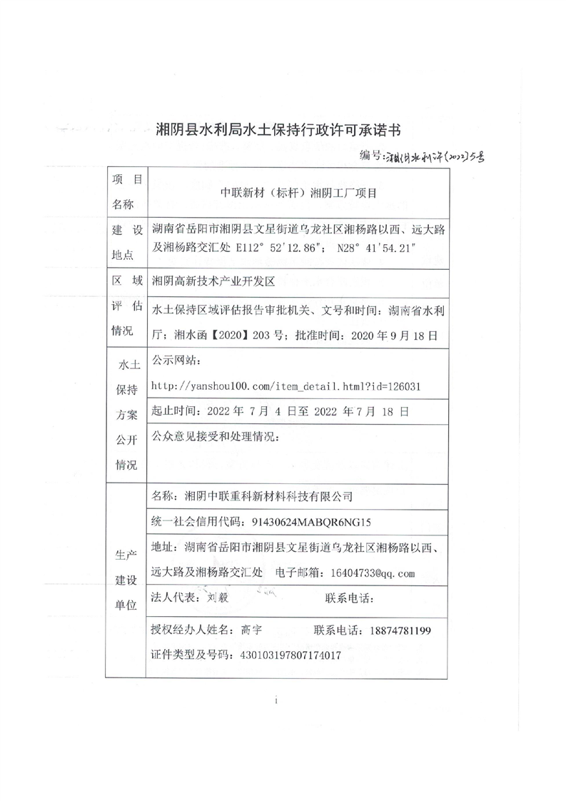 许05号(2022)中联新材(标杆)湘阴工厂项目水土保持行政许可承诺书