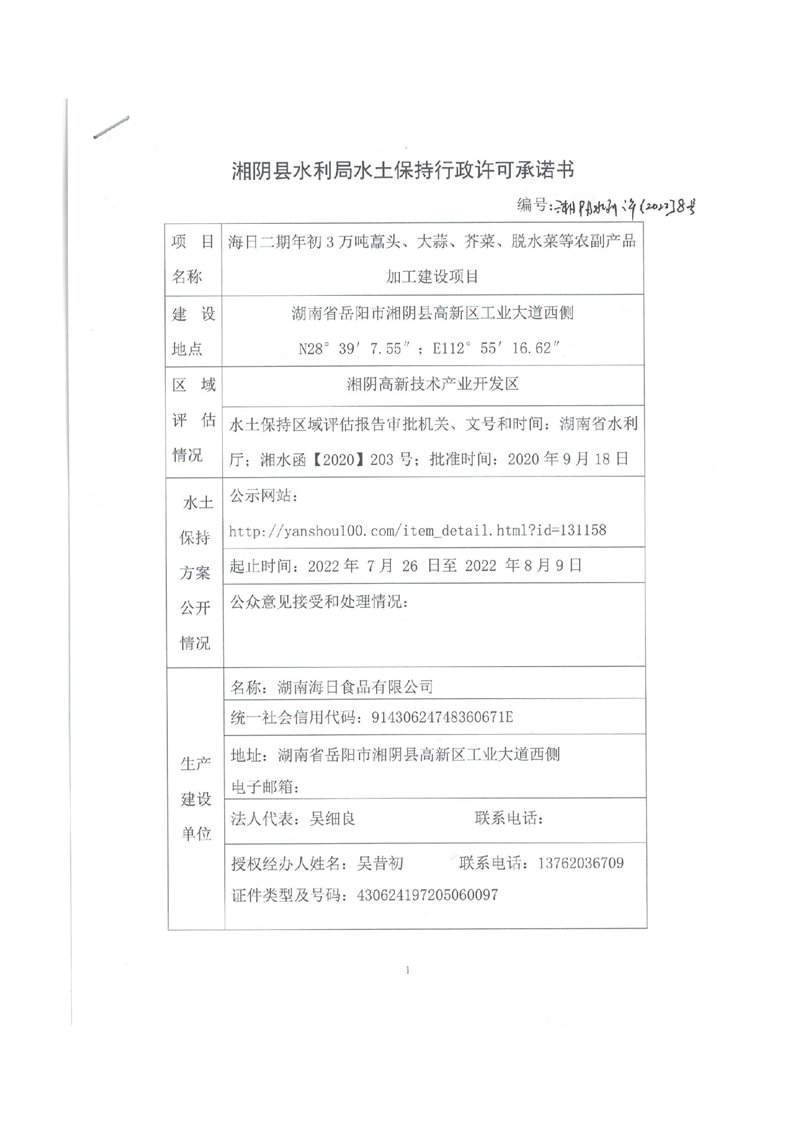 海日二期年产3万吨藠头、大蒜、芥菜、脱水菜等农副产品加工建设项目水土保持行政许可承诺书