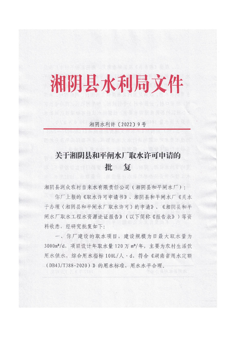 湘阴县和平闸水厂取水许可申请的批复