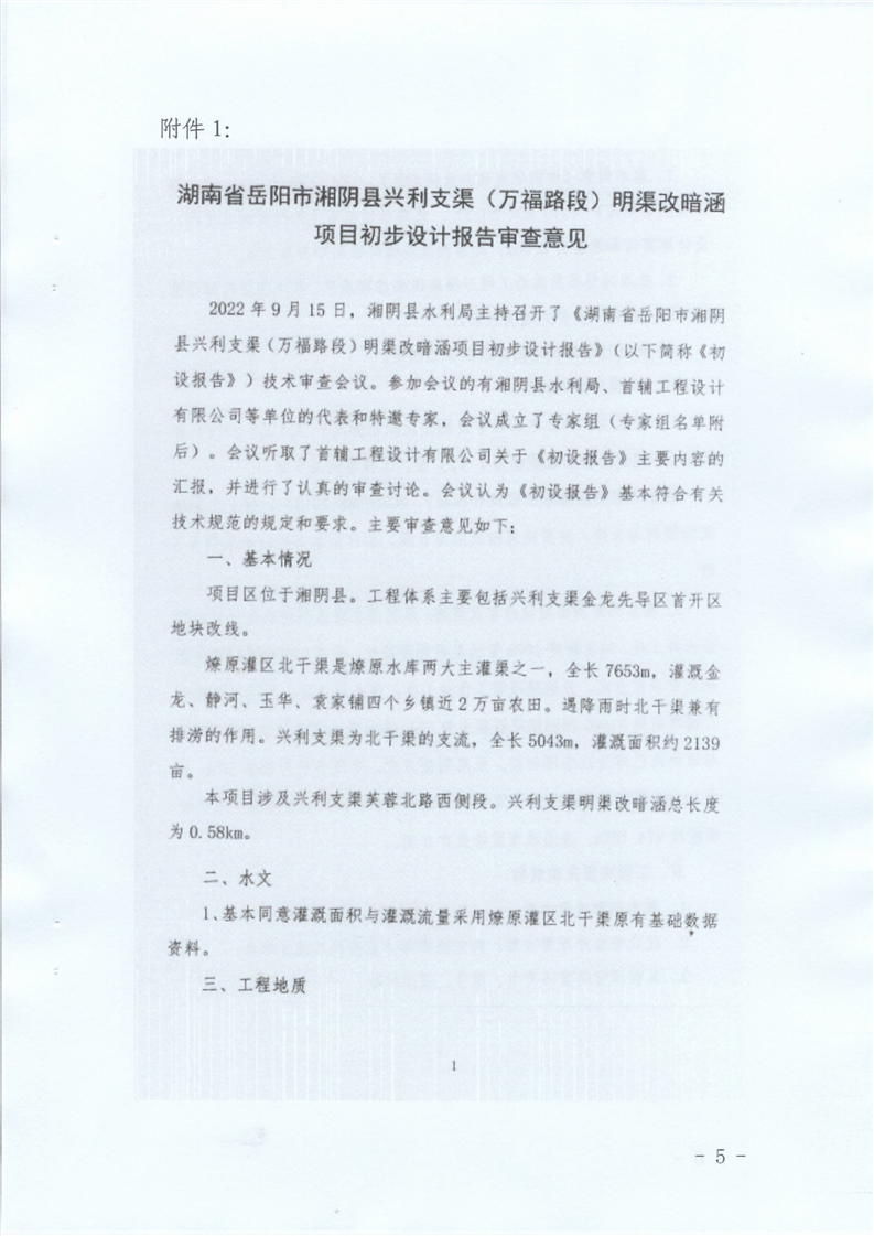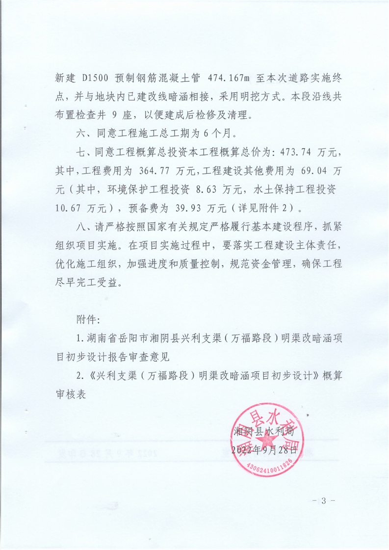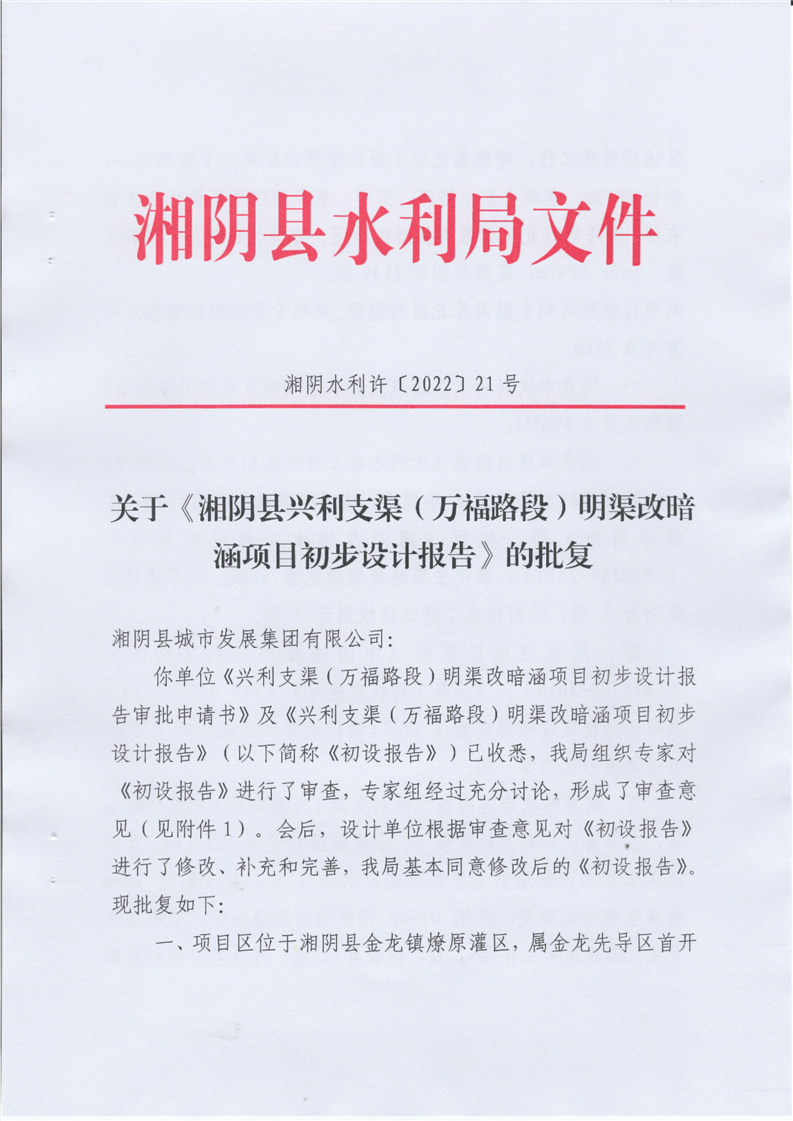 关于《湘阴县兴利支渠(万福路段)明渠改暗涵项目初步设计报告》的批复