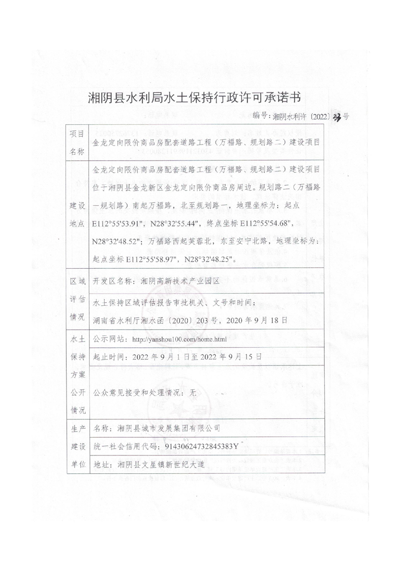 金龙定向限价商品房配套道路工程(万福路、规划路二)建设项目水土保持行政许可承诺书
